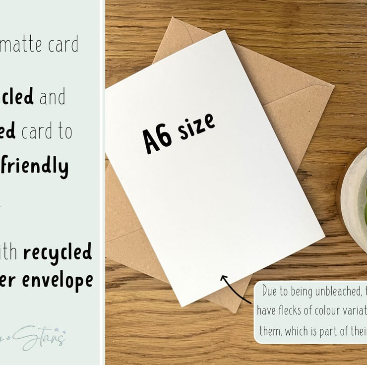 To be eco-friendly as possible, the cards are not dyed or bleached with chlorine so they have flecks of colour variation within them, which is part of their beauty.