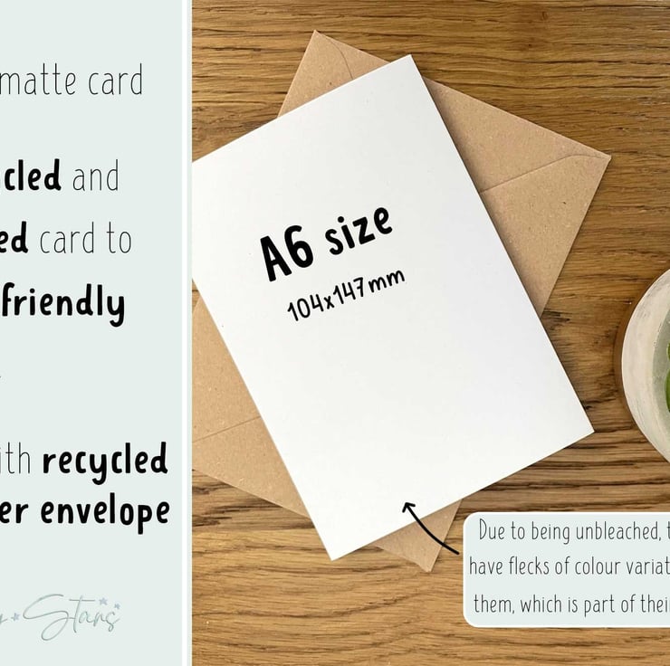 To be eco-friendly as possible, the cards are not dyed or bleached with chlorine so they have flecks of colour variation within them, which is part of their beauty.
