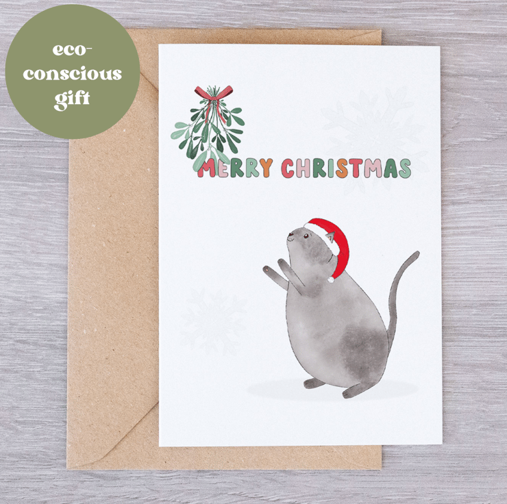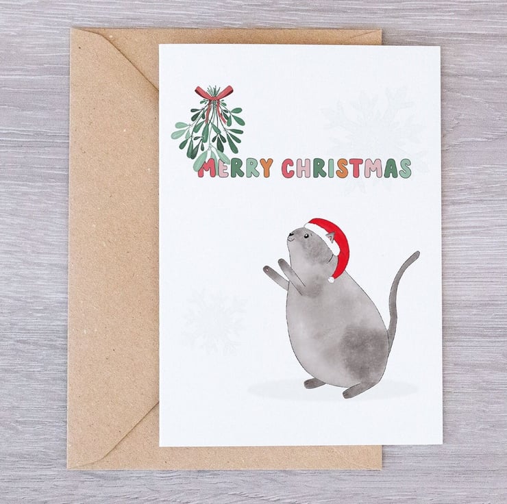 A fun Christmas card that features a whimsical grey cat wearing a Santa hat. The cat sits on its back legs and is trying to reach mistletoe. There are two large snowflakes in the background.