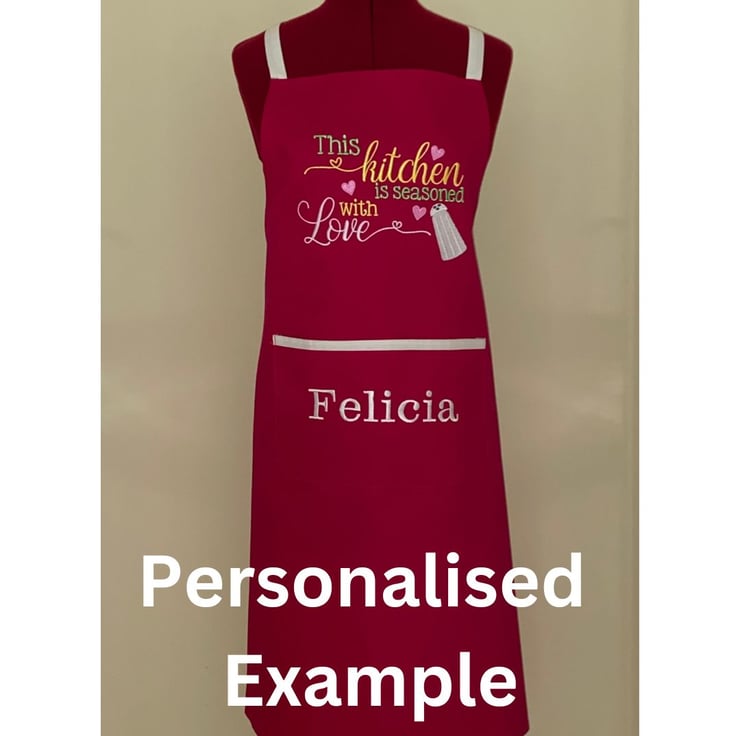 Exclusively Designed and Handmade by me, this is one of a selection of aprons I have made in a Professional Chef’s style, each with an embroidered motif design and a useful wide front pocket with cotton neck and tie-straps in a contrast colour.