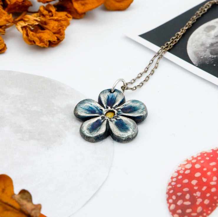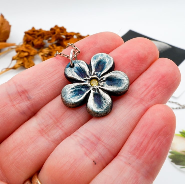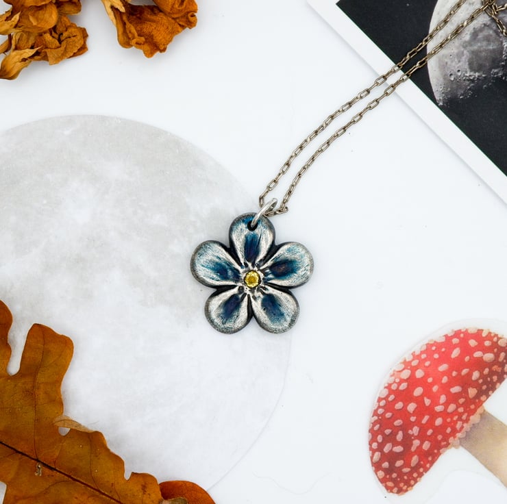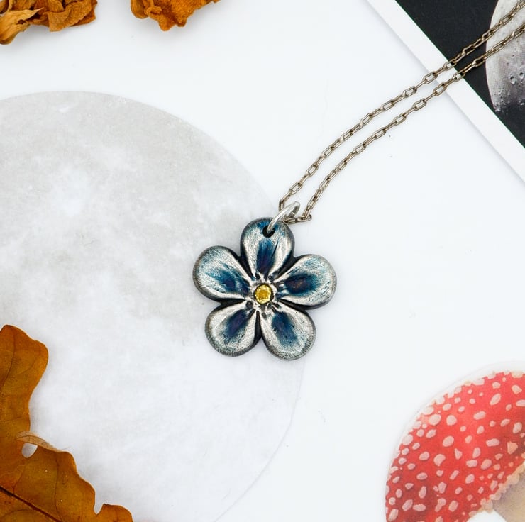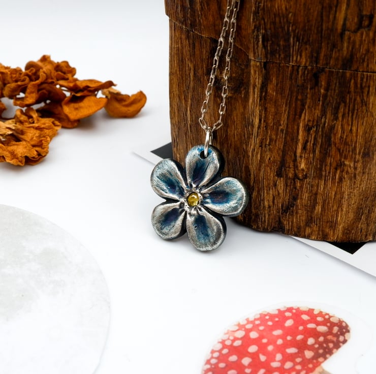I’ve hand-cast this forget-me-not pendant from recycled fine silver. At its heart is a sparkling Citrine gemstone, adding warmth and good vibes, with a soft blue patina for a pop of colour!