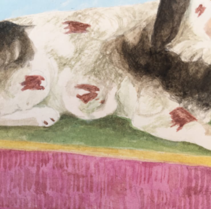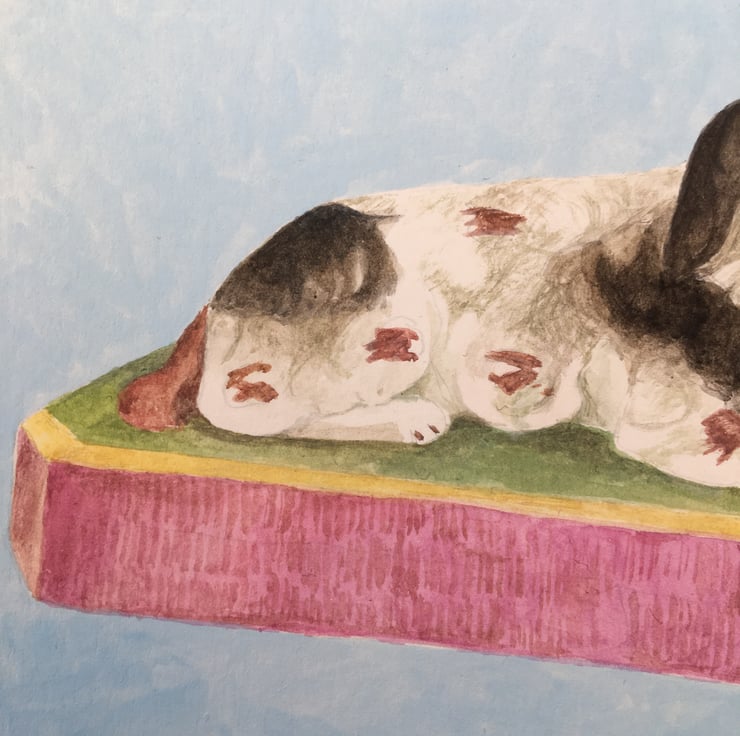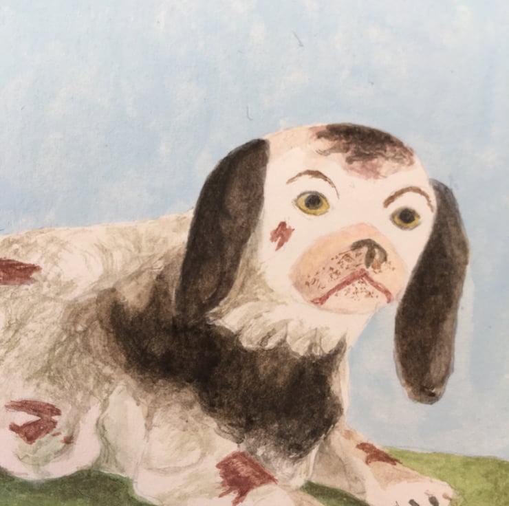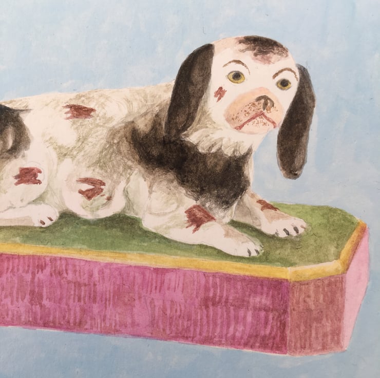 An original gouache painting of a Staffordshire pottery pearl ware figure of a spaniel dog. Gouache paints were used on 300gsm cold pressed acid free watercolour paper. The paper measures 15cm by 15cm and the image is 12cm by 12.5cm. An original painting that would make a special gift for someone. The painting will be sent inside a board back envelope.