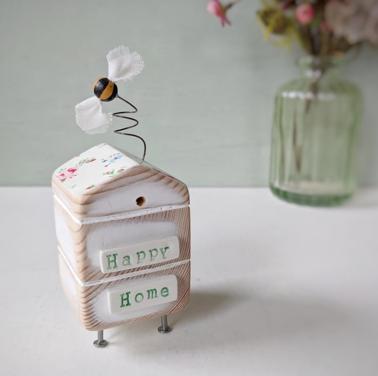 Painted white and sanded smooth the roof of the hive is adorned with flowers and the little bee dances on a bendy wire. The sign on the front reads 'Happy Home' and is made from polymer clay which is shaped, fired and painted.