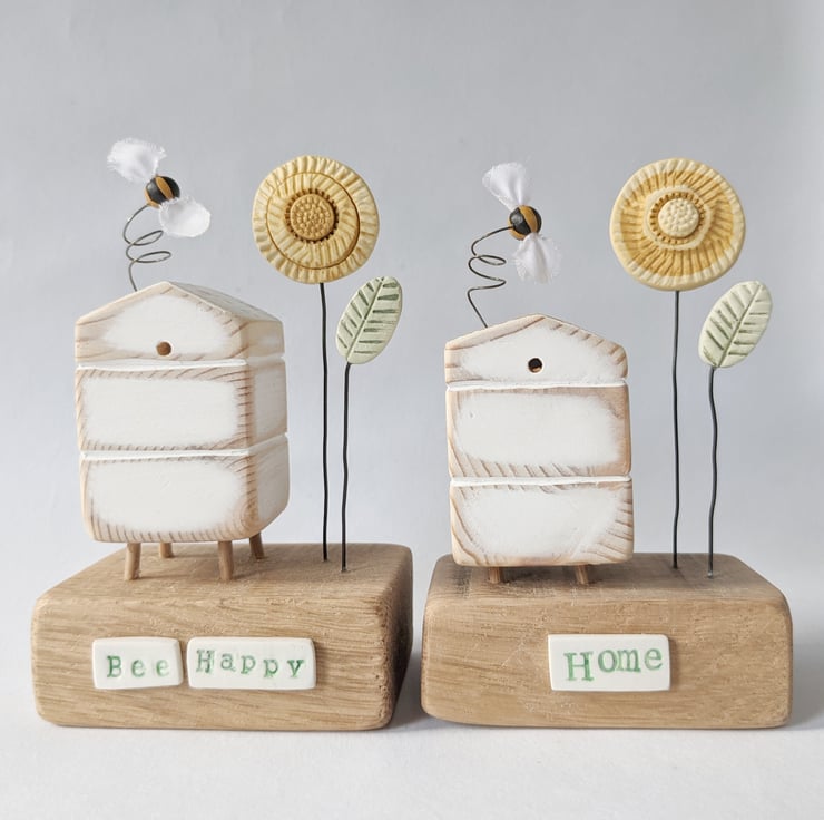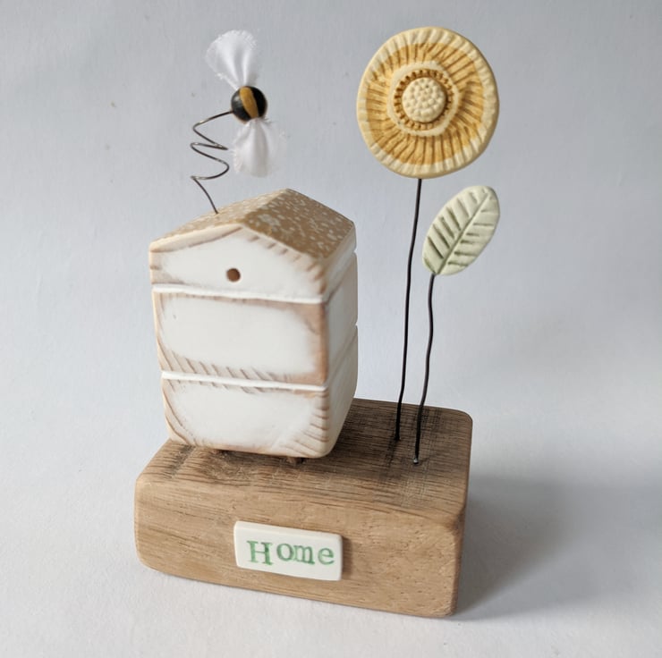 This little beehive is hand carved and painted, a tiny stripy bee buzzes on the pretty roof.