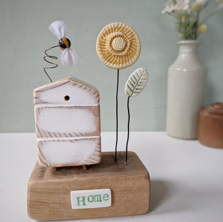 Painted white and sanded smooth it sits on a wooden block with a flower garden. The sign on the front reads 'Home'.