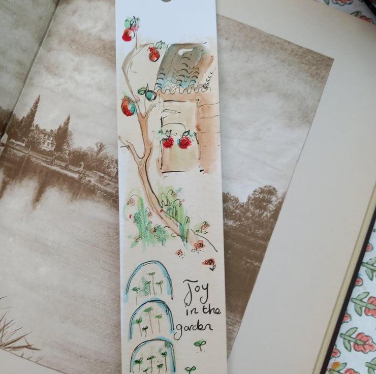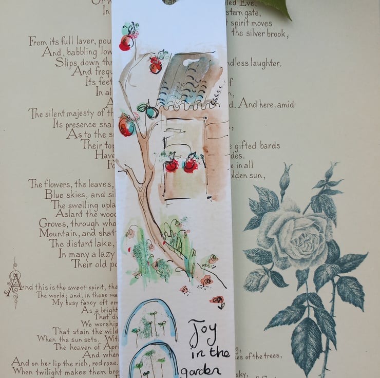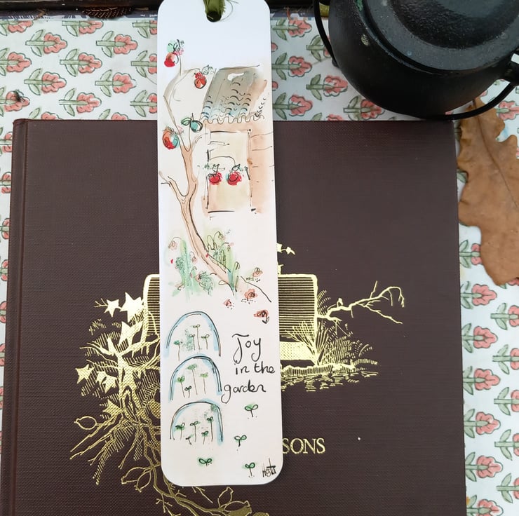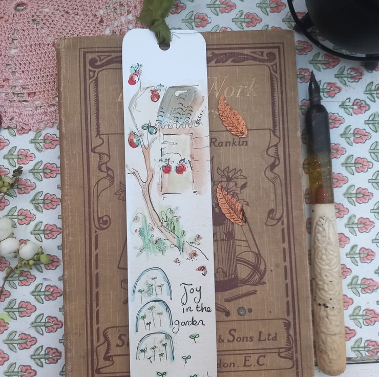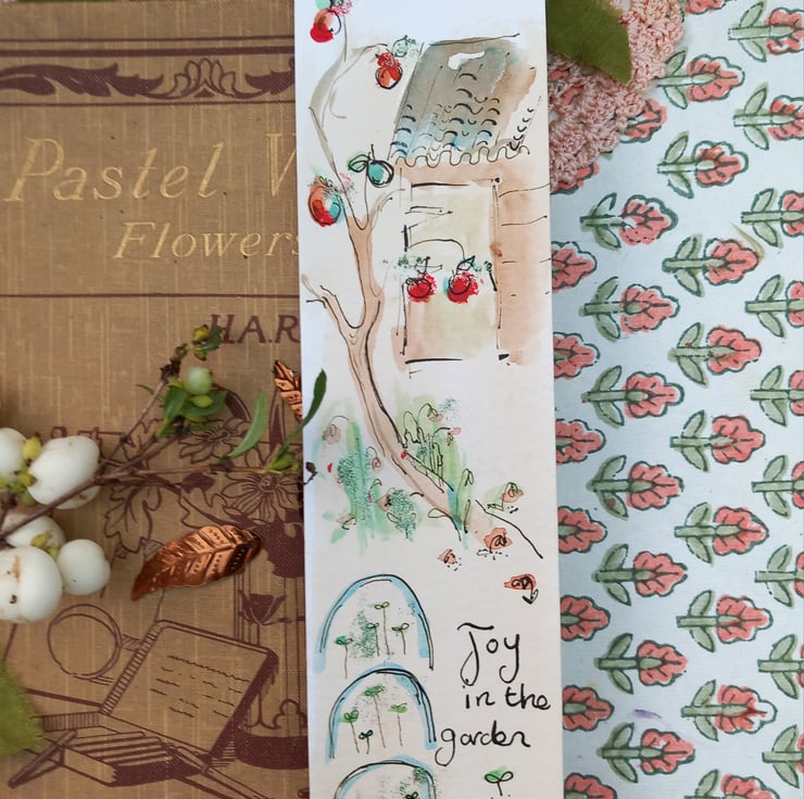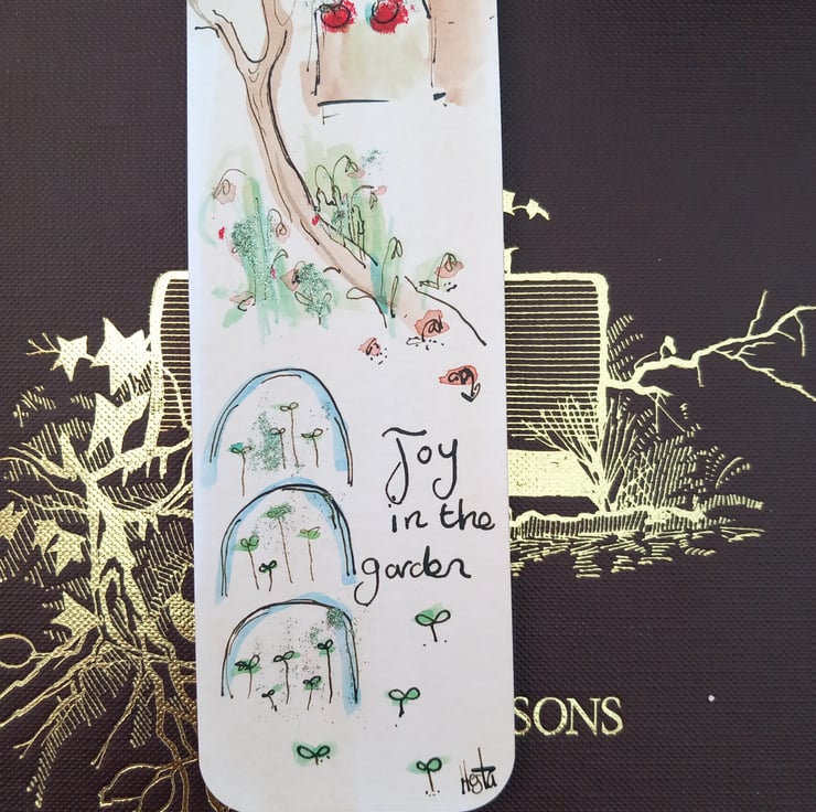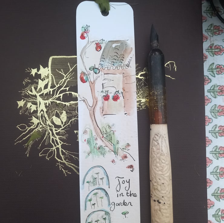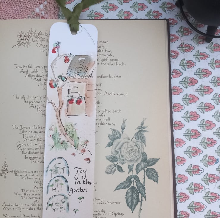 ' joy in the garden' Hand drawn and painted bookmark with silk ribbon '