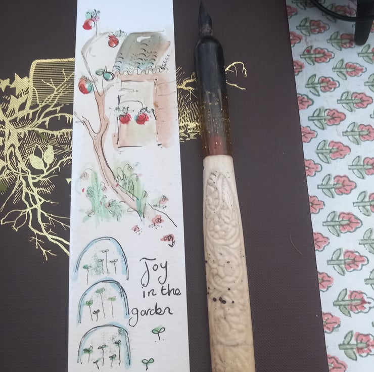 These are all individual. Hand drawn in Indian ink and painted with watercolours. So mini works of art. A simple gift to pop in a card or write a message on the back. With silk trim at the top. I also do personslised ones if you wish to have a name on them . X a gift for a nature and book lover x small gift to sit along side your favourite book. Comes thoughtfully wrapped.
