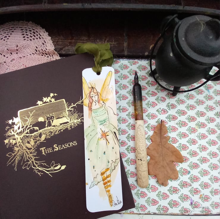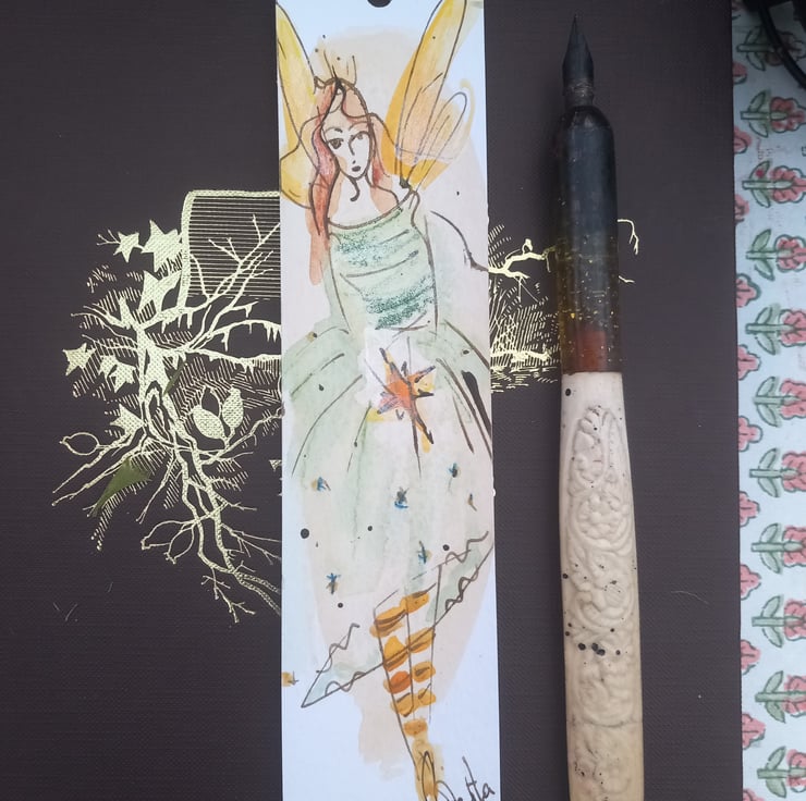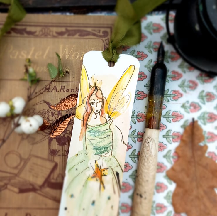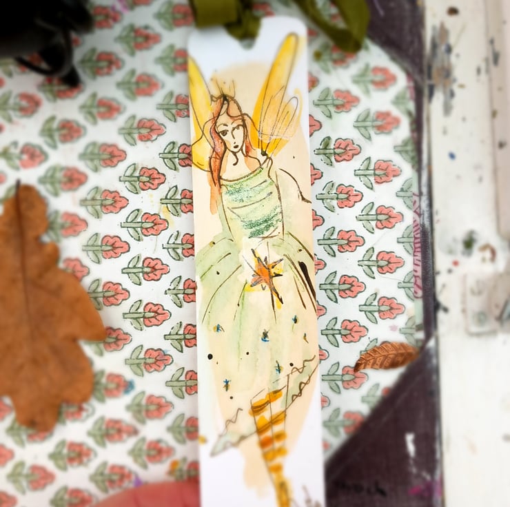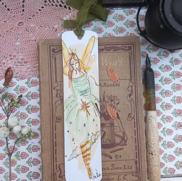 'Fairy' 'Hand drawn and painted bookmark with silk ribbon '