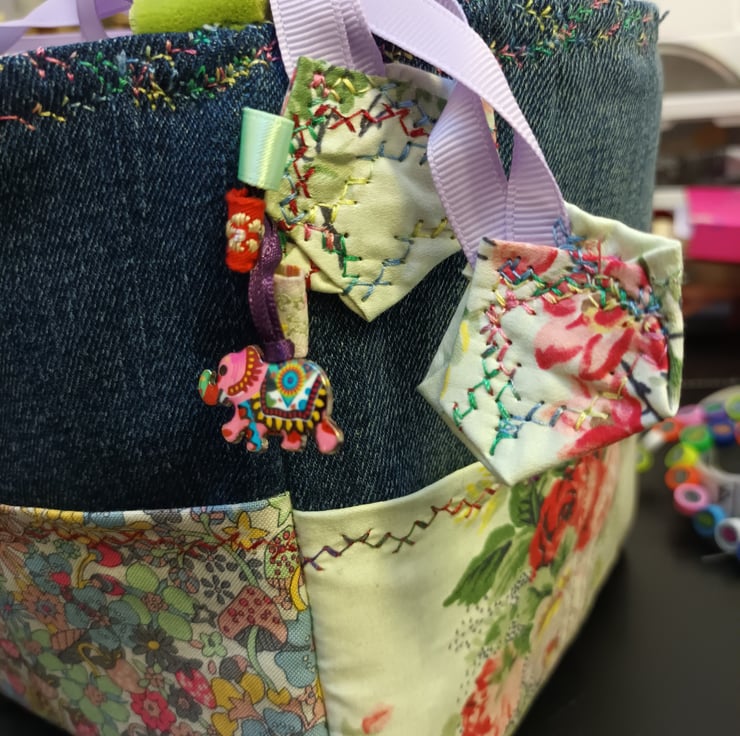 Pretty surface embroidery and an enamelled elephant charm complete the decoration.