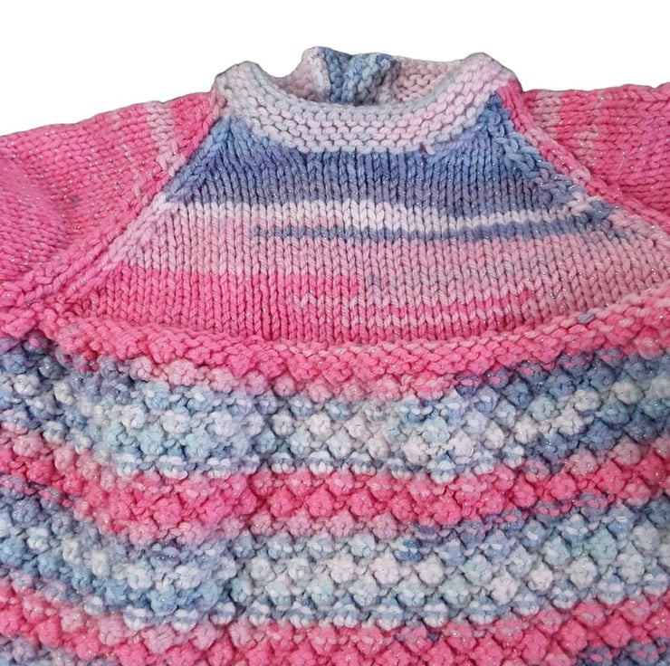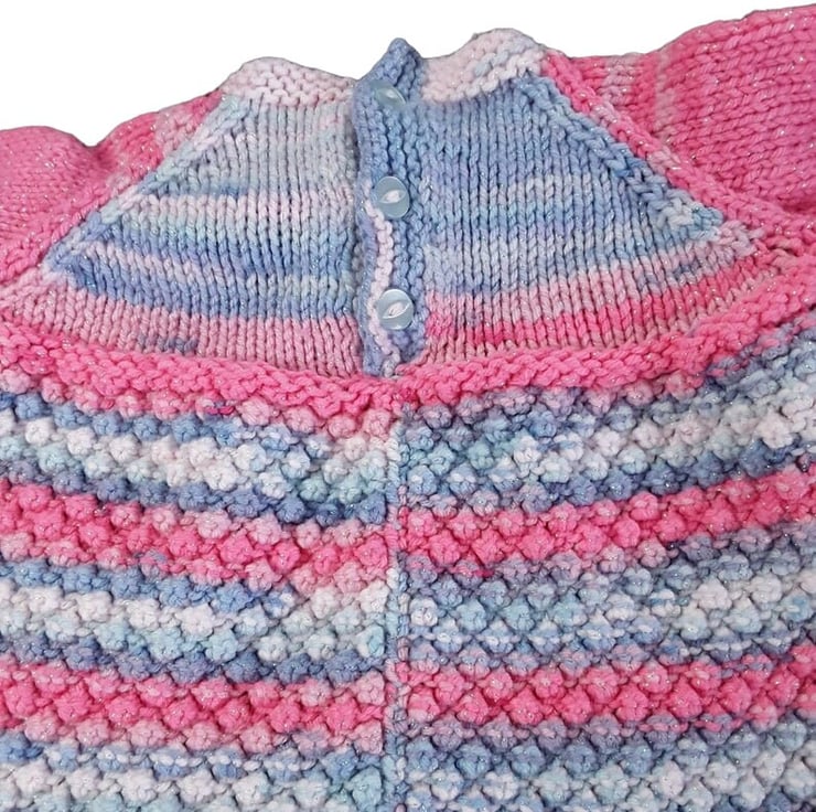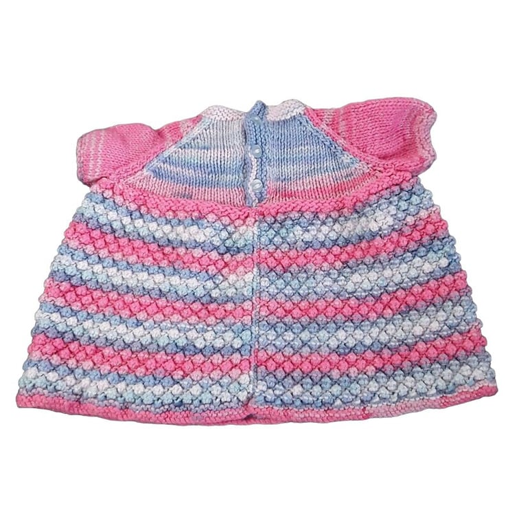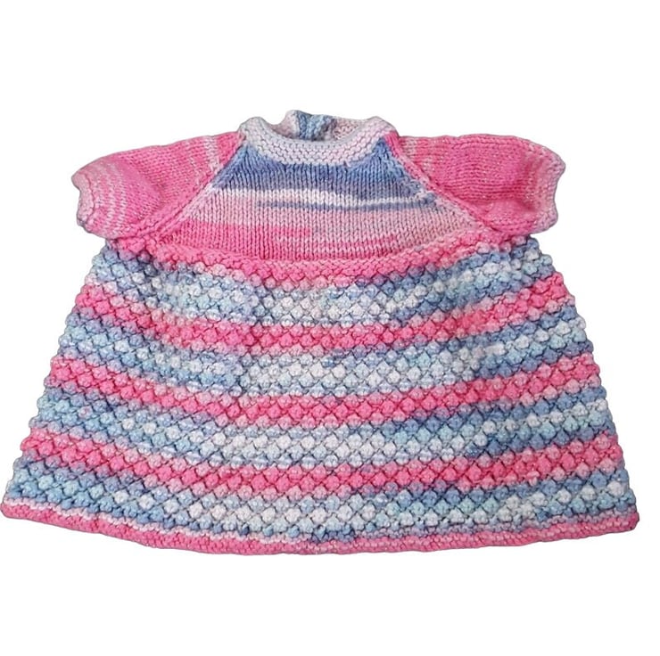 Crafted with care, this delightful baby girl's dress is hand knitted using a soft and sparkly pink and blue yarn. The dress features an adorable bobble pattern on the skirt, while the bodice and sleeves are designed in classic stocking stitch. With short sleeves and a comfortable round neckline, this dress is both stylish and practical. The back is adorned with sweet buttons for easy dressing.