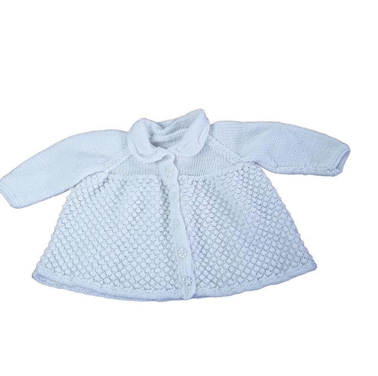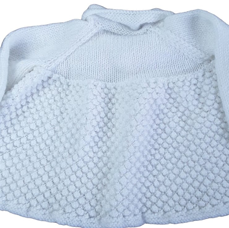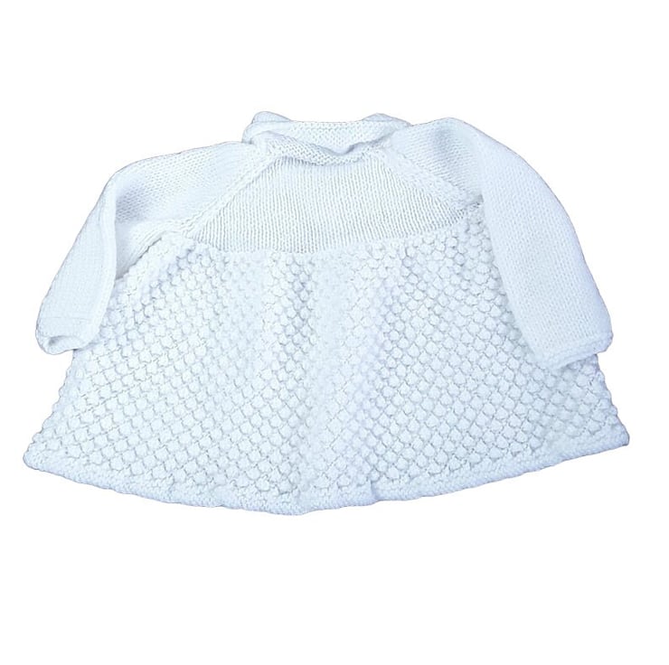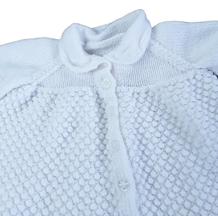 The matching cardigan, hand-knitted in pristine white yarn, complements the dress with the same charming bobble pattern. It features long sleeves and a round neckline with convenient front button fastening.