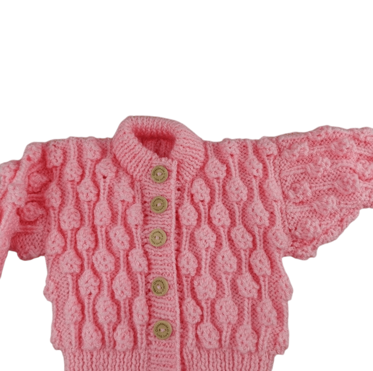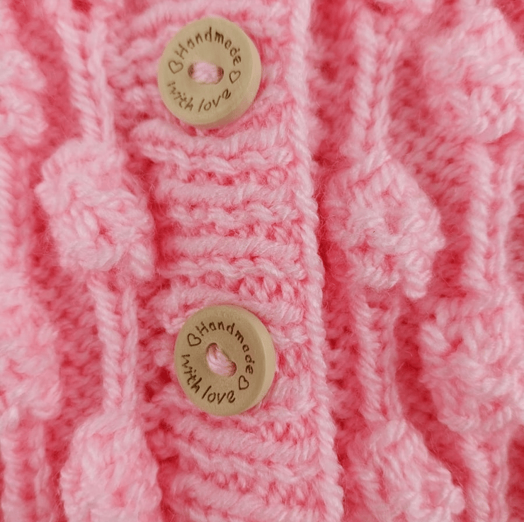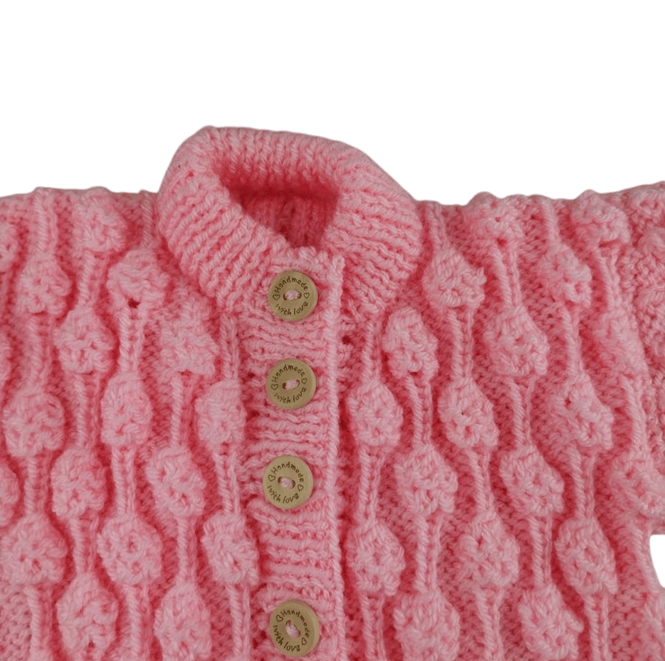 This adorable cardigan is a labour of love, meticulously hand-knitted in a delightful candyfloss pink hue. It features an enchanting all-over textured bobble pattern, giving it a unique and charming look. The round neck and long sleeves ensure both style and warmth for your little one. What makes this cardigan extra special is the wooden buttons that read "handmade with love" and provide a touch of craftsmanship and care.