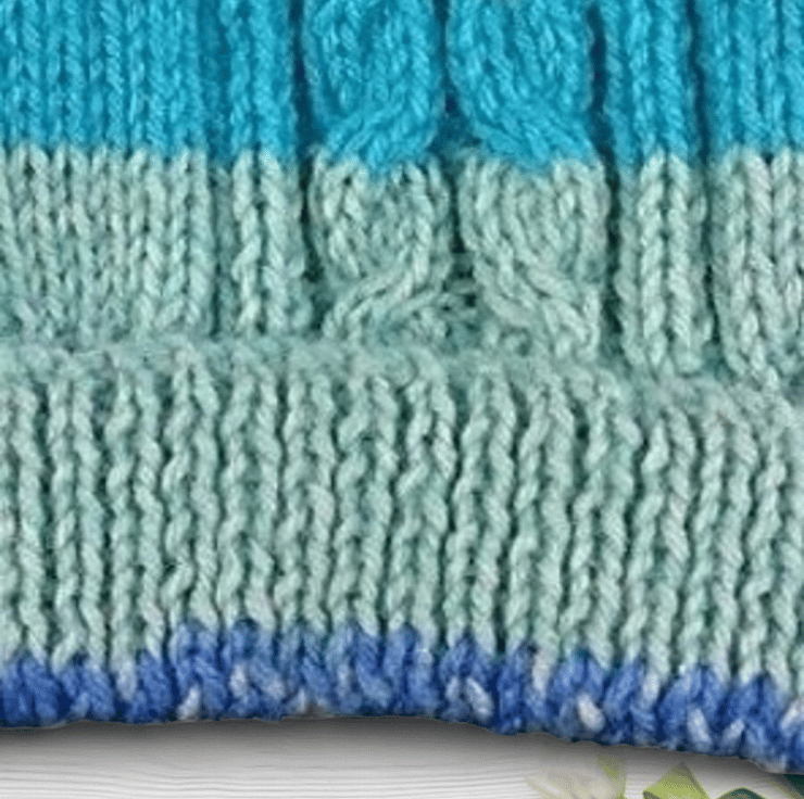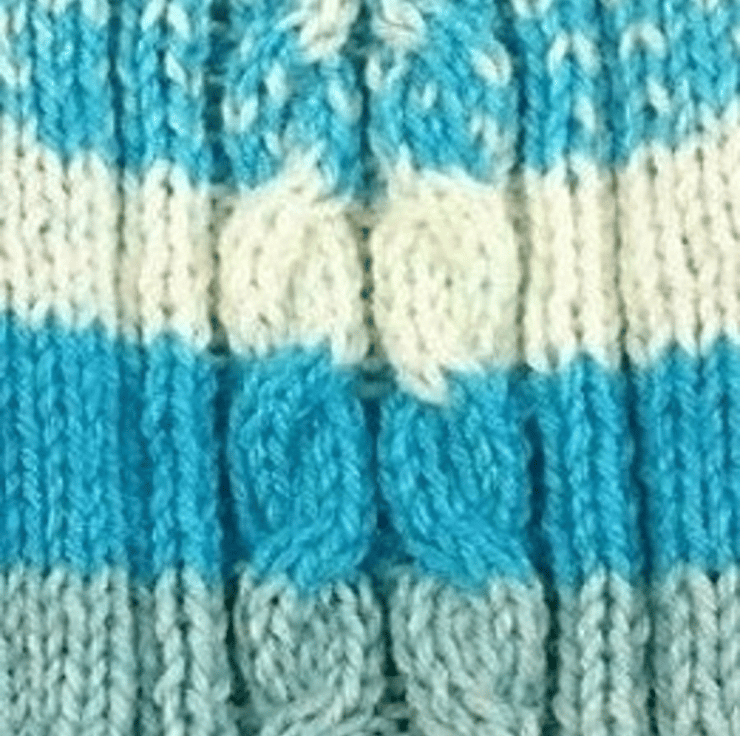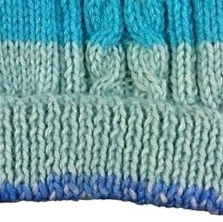 Warm baby hat hand knitted using aran yarn in a blue and cream mix which forms a striped pattern as you knit. The hat has a double cable pattern.