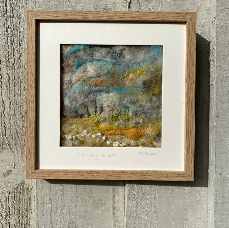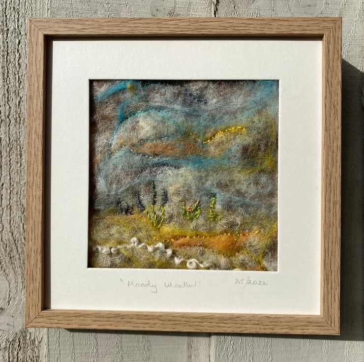 This beautiful needle felted picture is inspired by the moody skies of Autumn. Blues and greys with the sun peeping through. The gold yellow of a beach dune on the Lincolnshire coast with wild plants growing and created with embroidery.