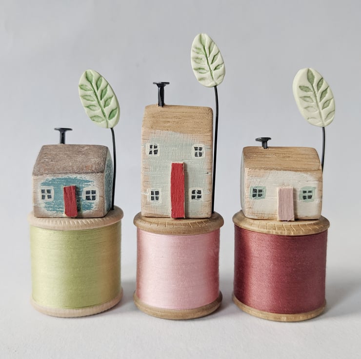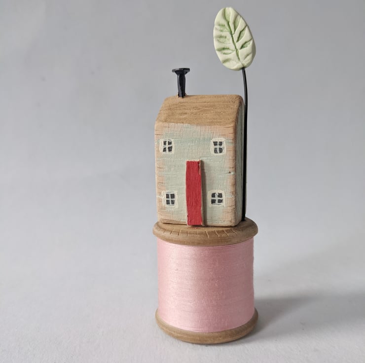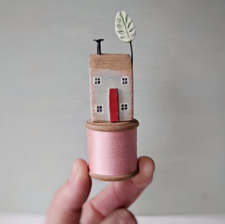 A hand painted little wooden house sits on a vintage bobbin. A patterned and painted clay tree stands beside it.