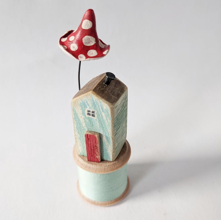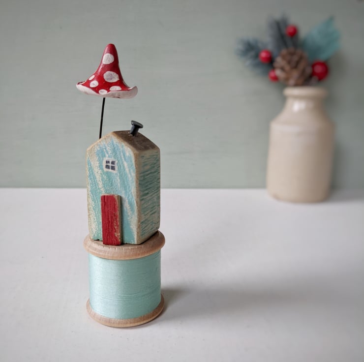 I love finding these old bobbins on rummaging trips! The tiny homes perch happily on top.