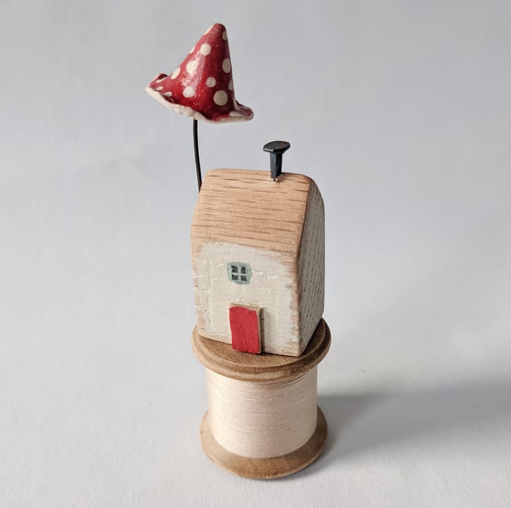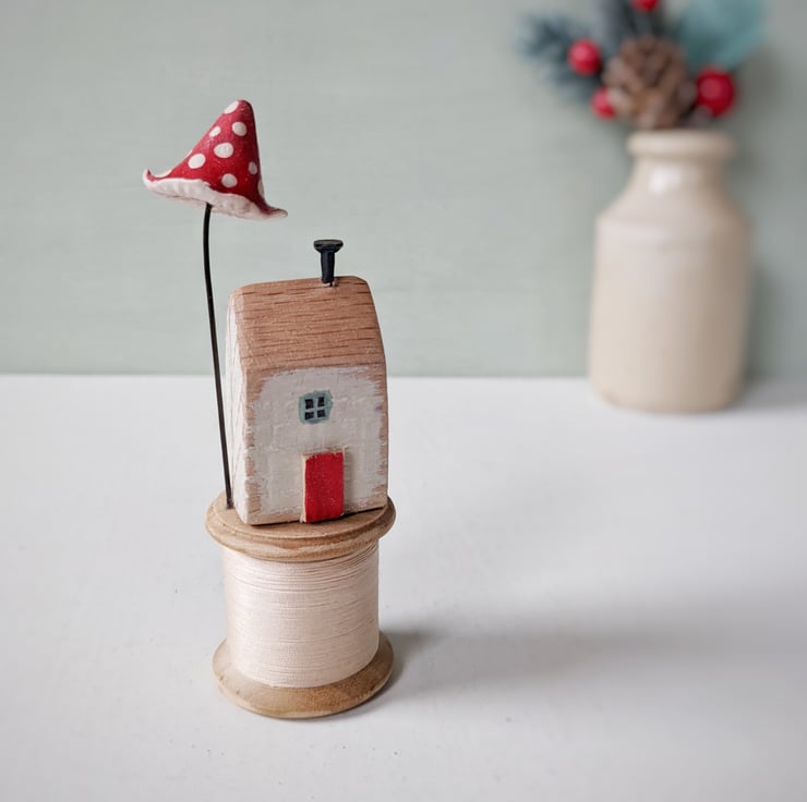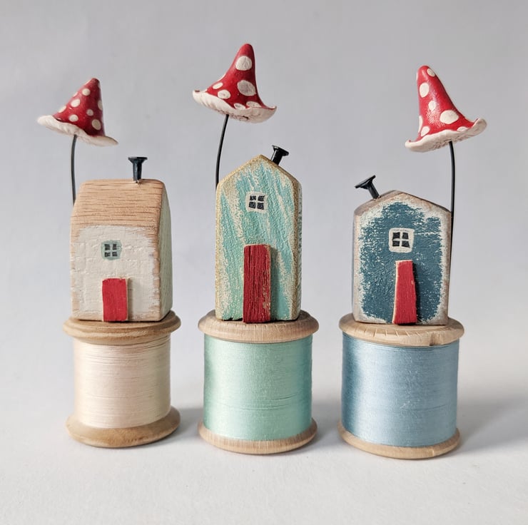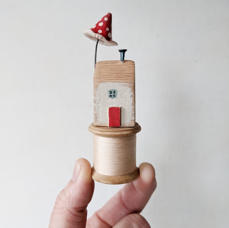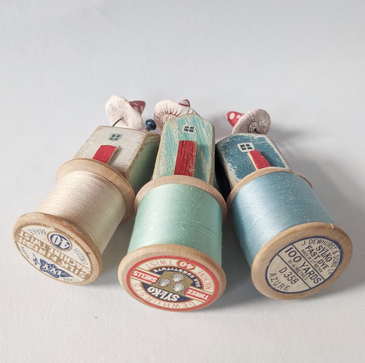 I love finding these old bobbins on rummaging trips! The tiny homes perch happily on top.