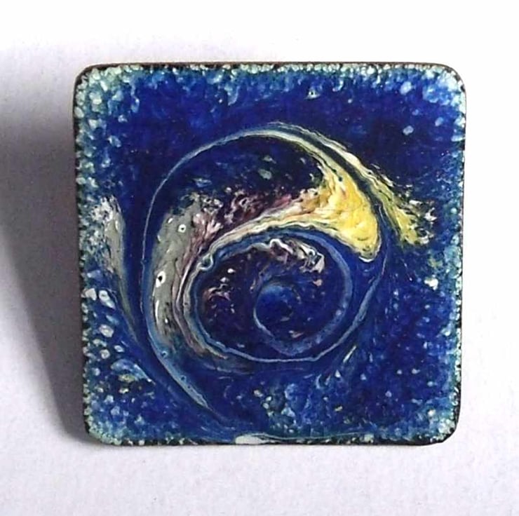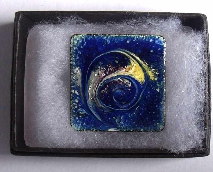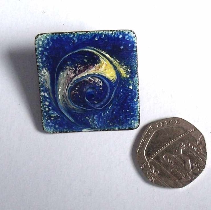 This 30mm square brooch has a scrolled design in purple shading to yellow on a mottled deep blue and white background.
