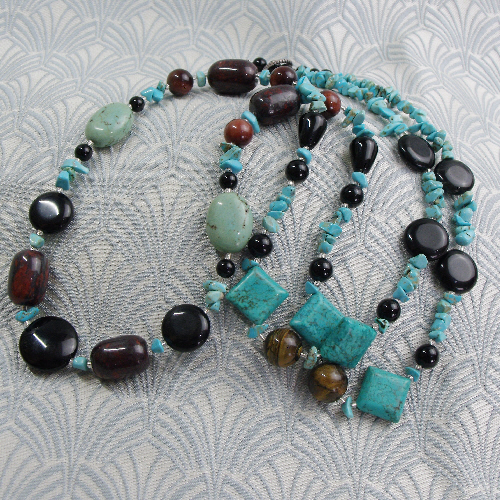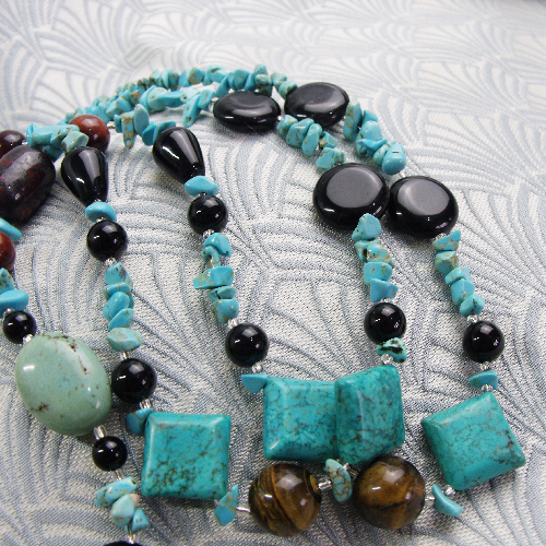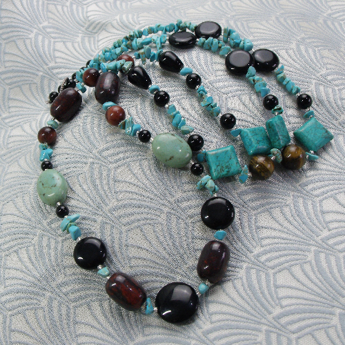 In this long semi-precious stone turquoise necklace has been set with discs of black onyx semi-precious stone discs, oval soft blue coloured turquoise beads, red tigers eye beads, nuggets of jasper and diamond shaped turquoise beads.