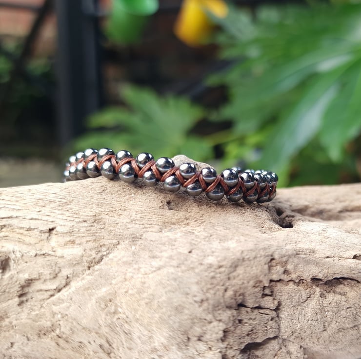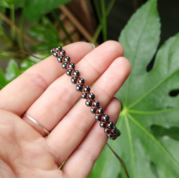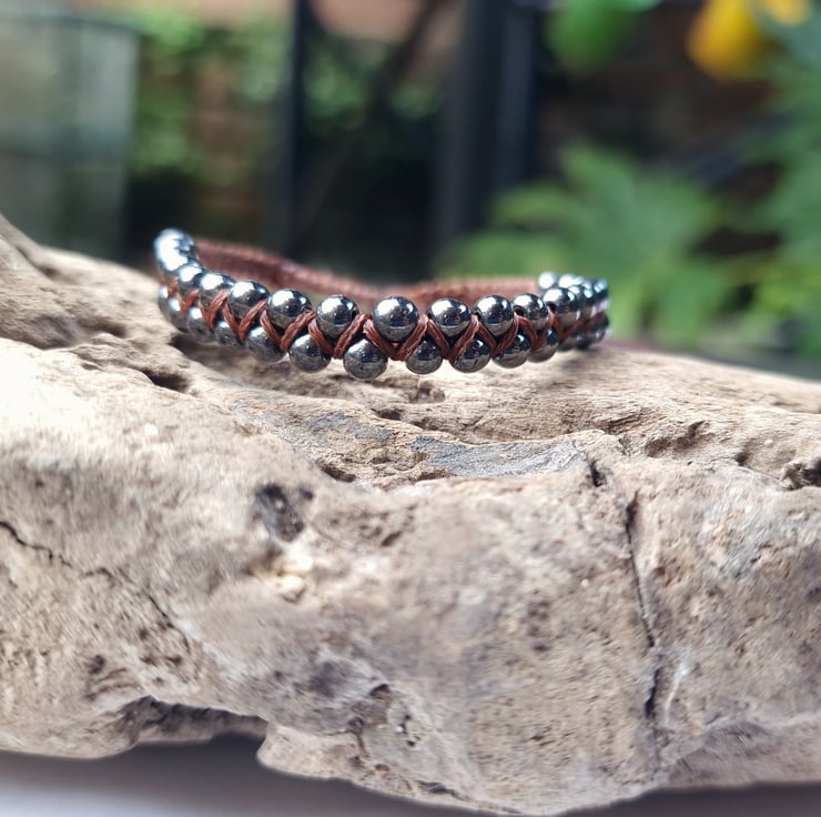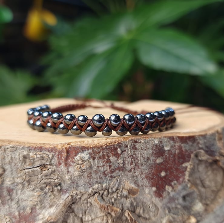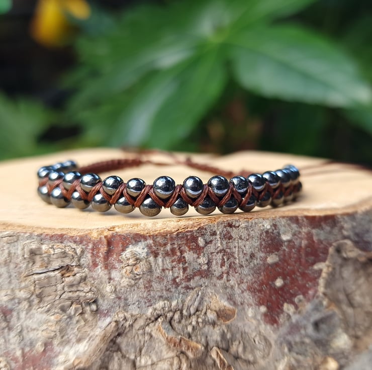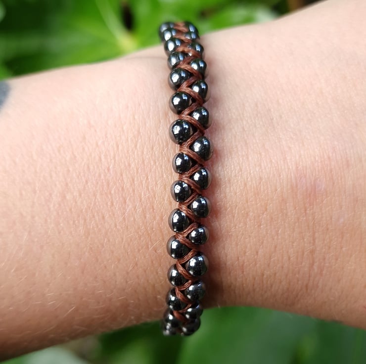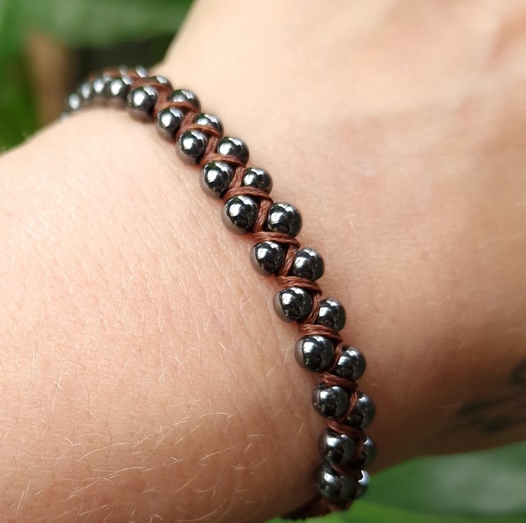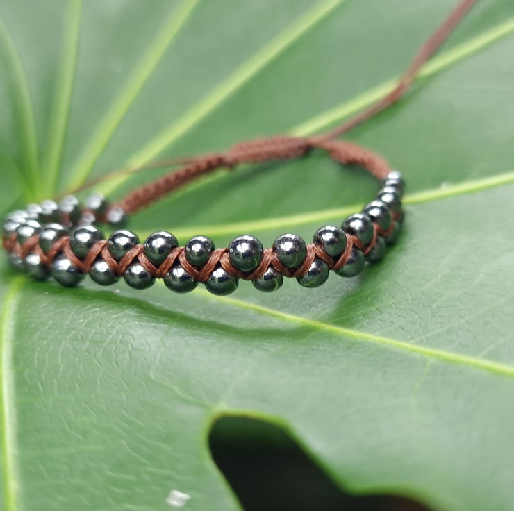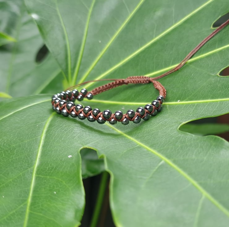 Handmade Hematite Macrame Beaded gemstone bracelet made with 4 - 5 mm Hematite beads and dark brown waxed cord.
