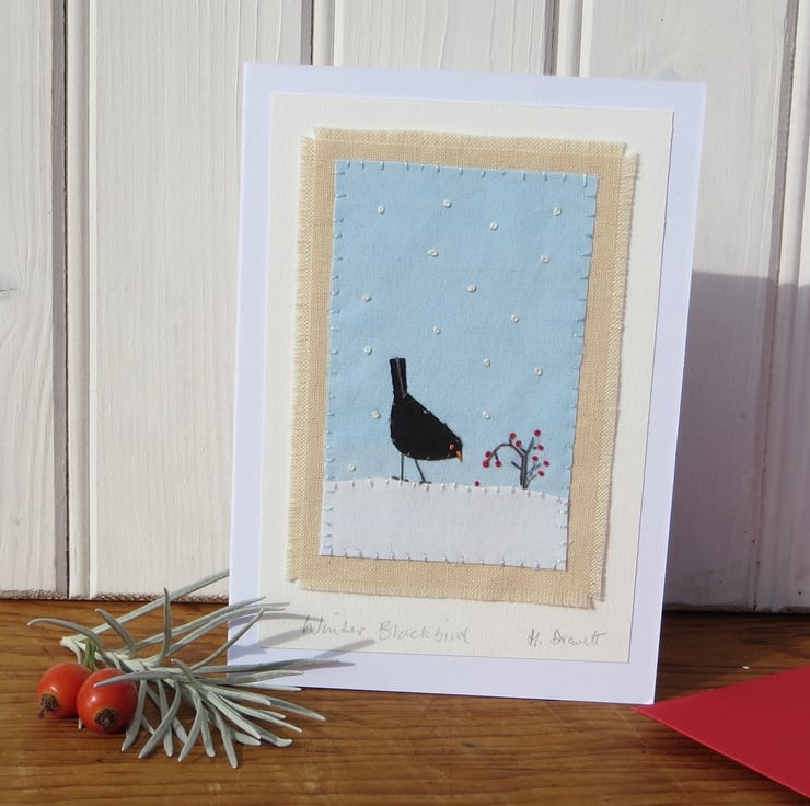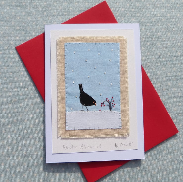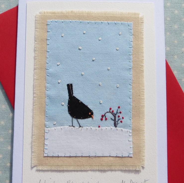 A miniature hand-stitched applique blackbird in snow with intricate top-stitched details including a bush of berries. Background blue cotton is recycled and hand-dyed. Perfect for any winter celebration, Christmas, or a thank you card to keep!