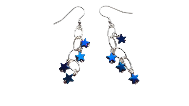 Each hematite star hangs separately from the chain, they spiral around the centre line in such a way that the earrings are a mirror image of each other.