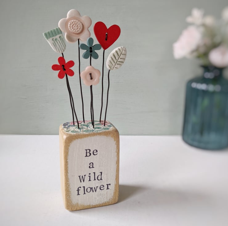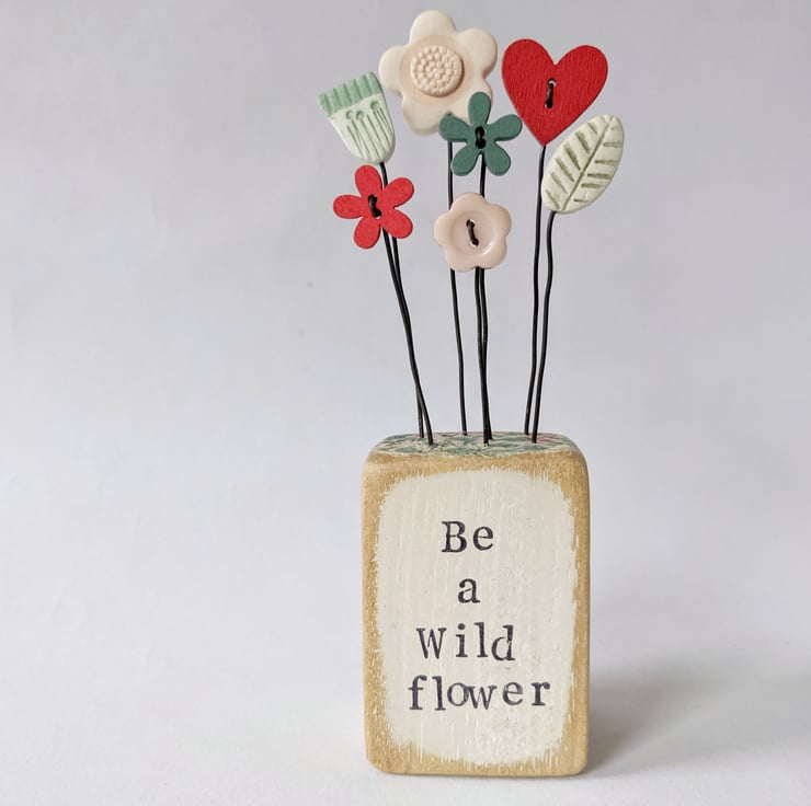 A pretty clay flower stands on a wire stalk in a painted wooden block.