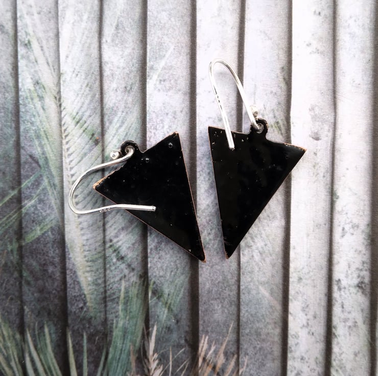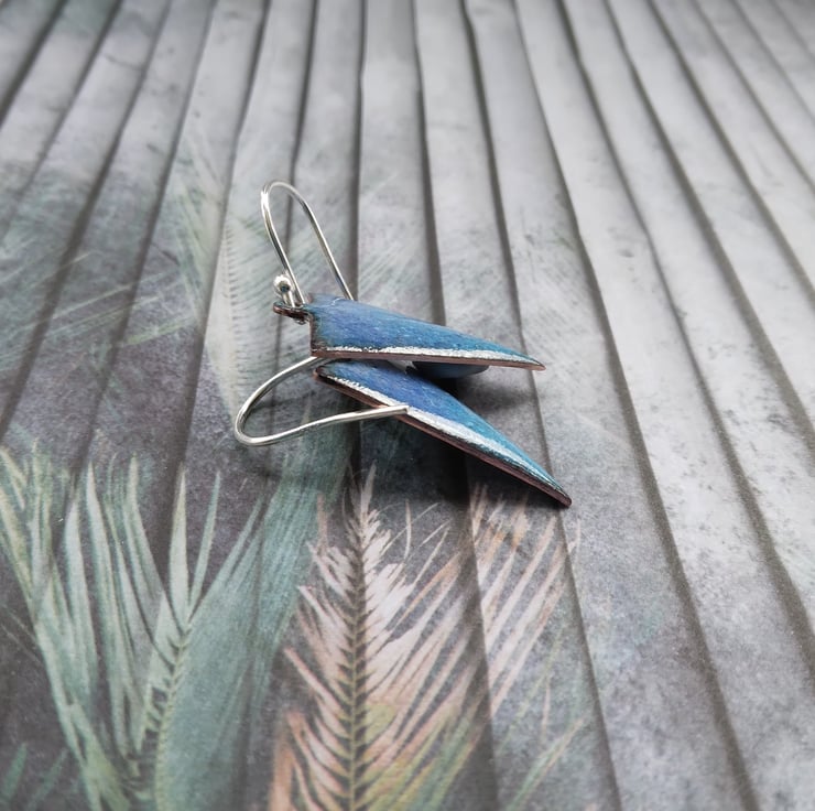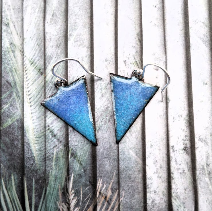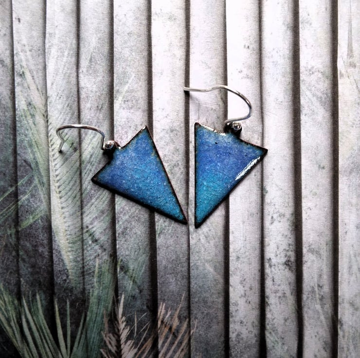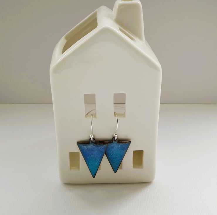 A pair of beautiful triangular copper earrings in shades of blue enamel. The earrings have been kiln-fired and each measures 25mm from top to tip and 17mm across the widest part, and come complete with sterling silver earring wires. The backs have been finished in glossy black enamel and they are supplied with a little organza pouch.