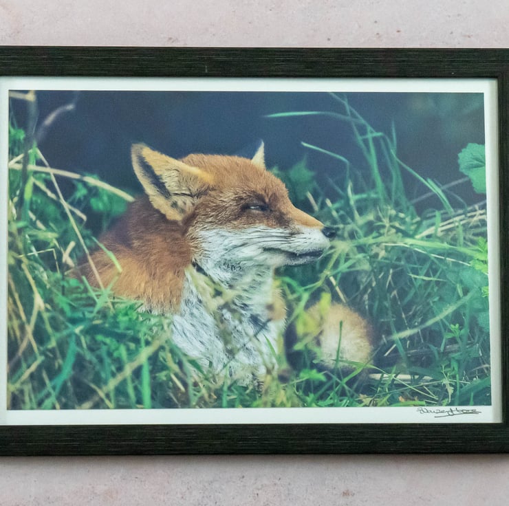 Framed and hand-signed photo of a beautiful Red Fox which I came across as it lay dozing in the grass. I took the photo in October 2021 in Surrey, UK