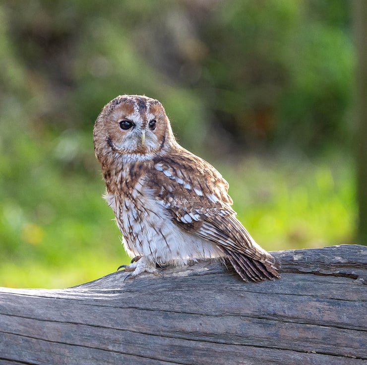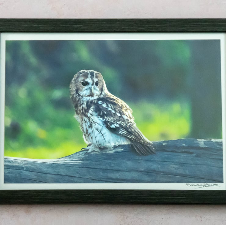 Hand-Signed, framed photo of a Tawny Owl perched on a log. I took the photo in Lingfield, Surrey in October 2021.