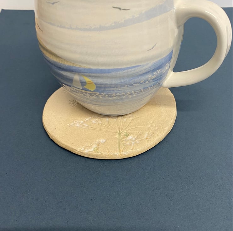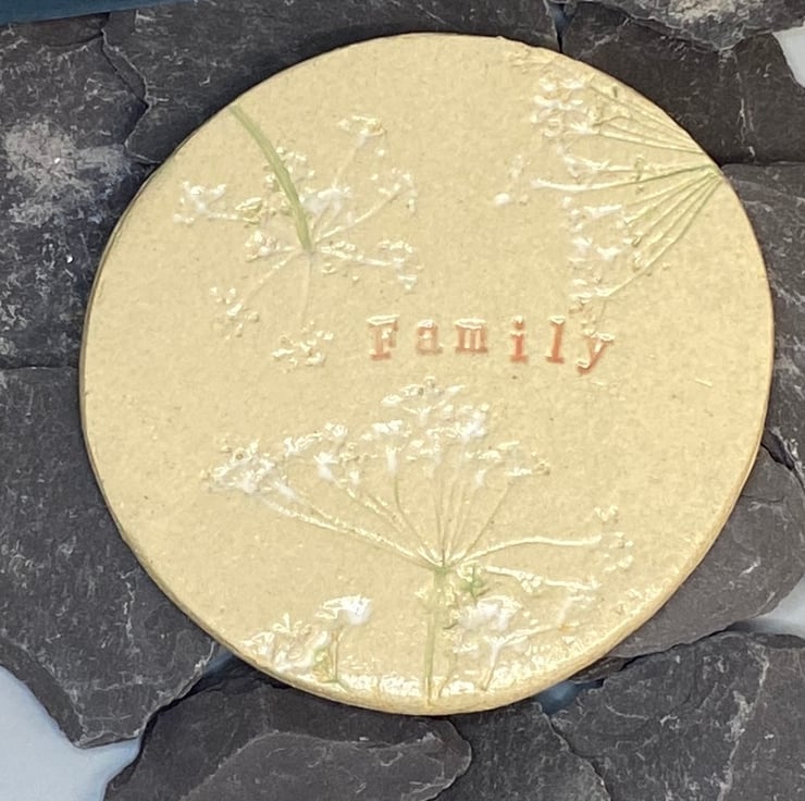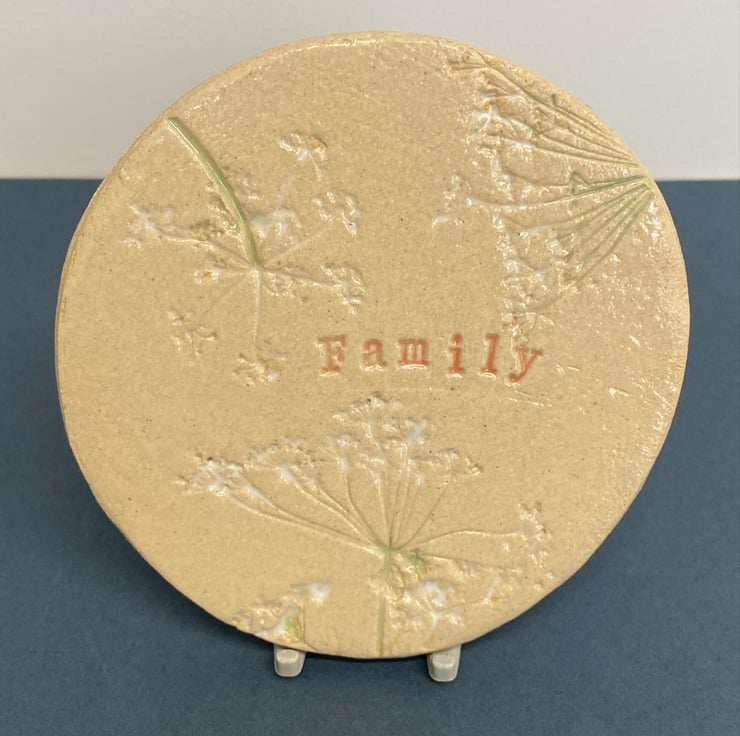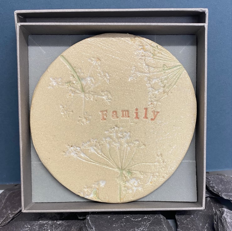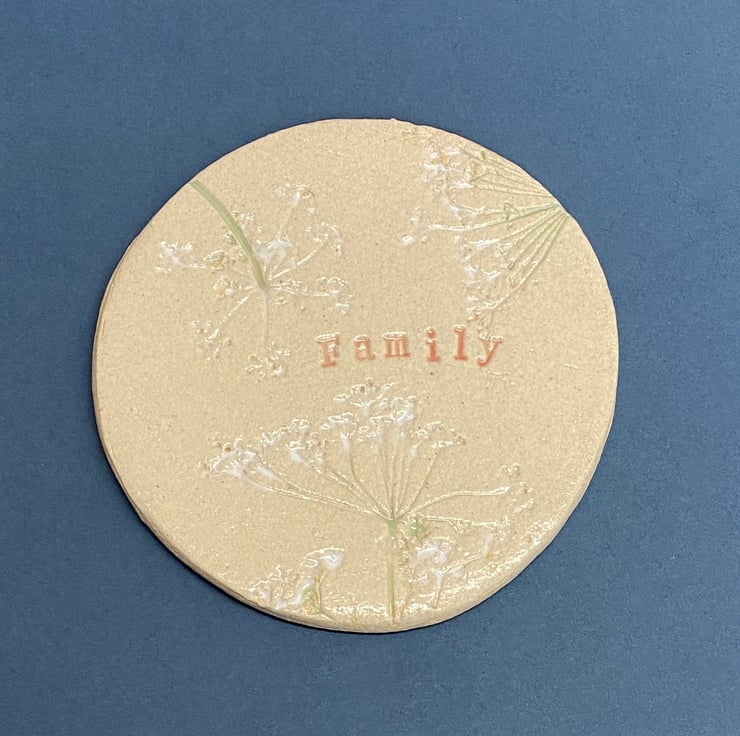 This handmade ceramic coaster has been created from earthenware clay which is rolled by hand. The word 'Family' and hedgerow flowers have been pressed into the clay, which is then under glazed and kiln fired.
