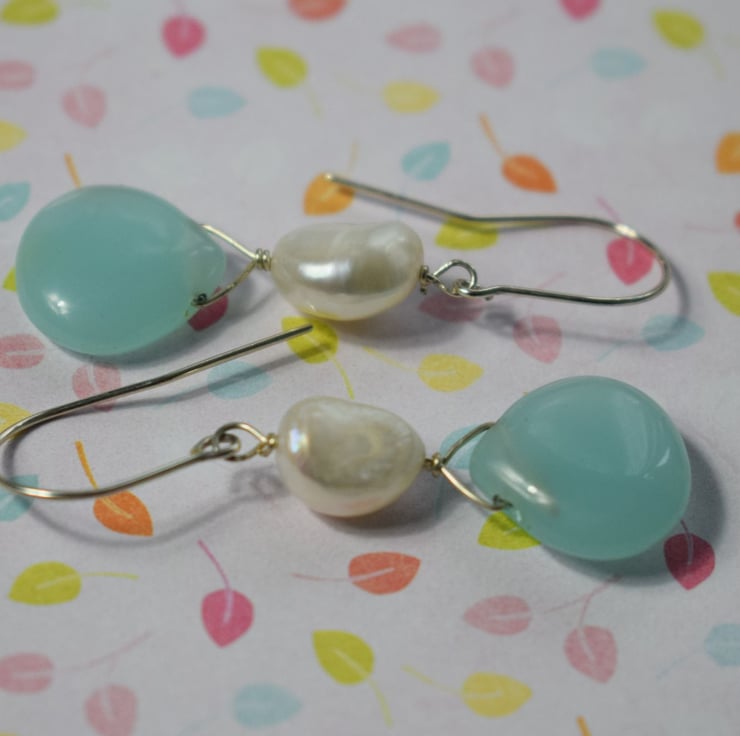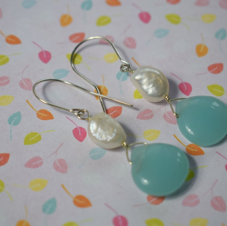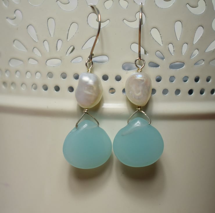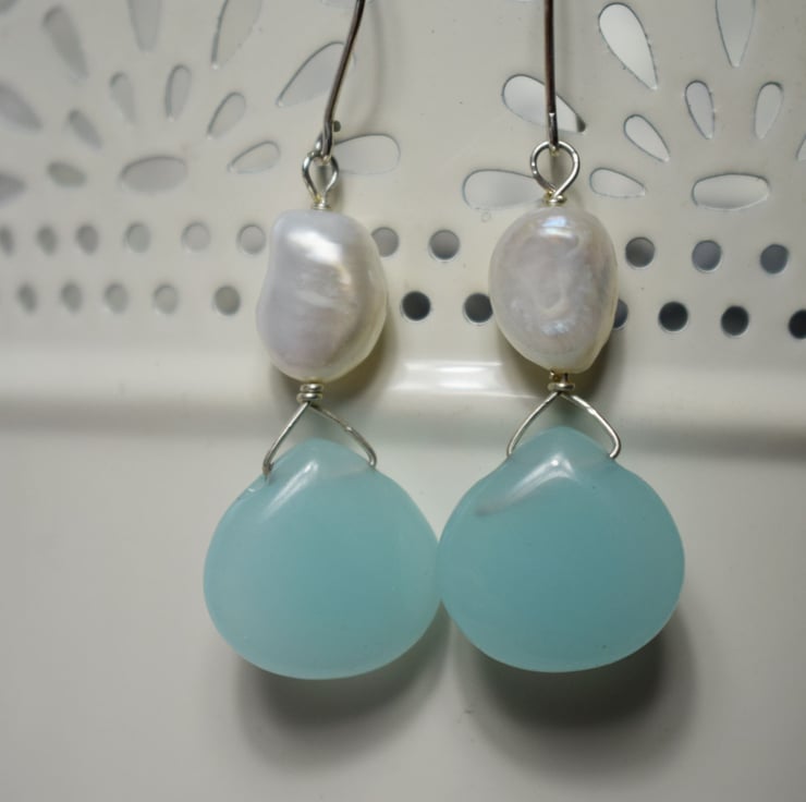 Perfect for your wedding day these earrings are made with pale blue agate teardrops below ivory freshwater pearls. All wire and earwires are sterling silver so with a little polish now and then you'll be wearing these in years to come, maybe even for your pearl anniversary! These earrings would also make a lovely gift for the mother of the bride, something to treasure from a special day!