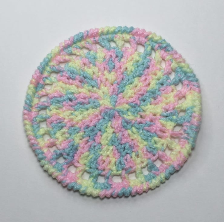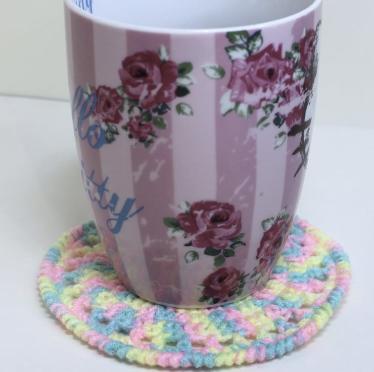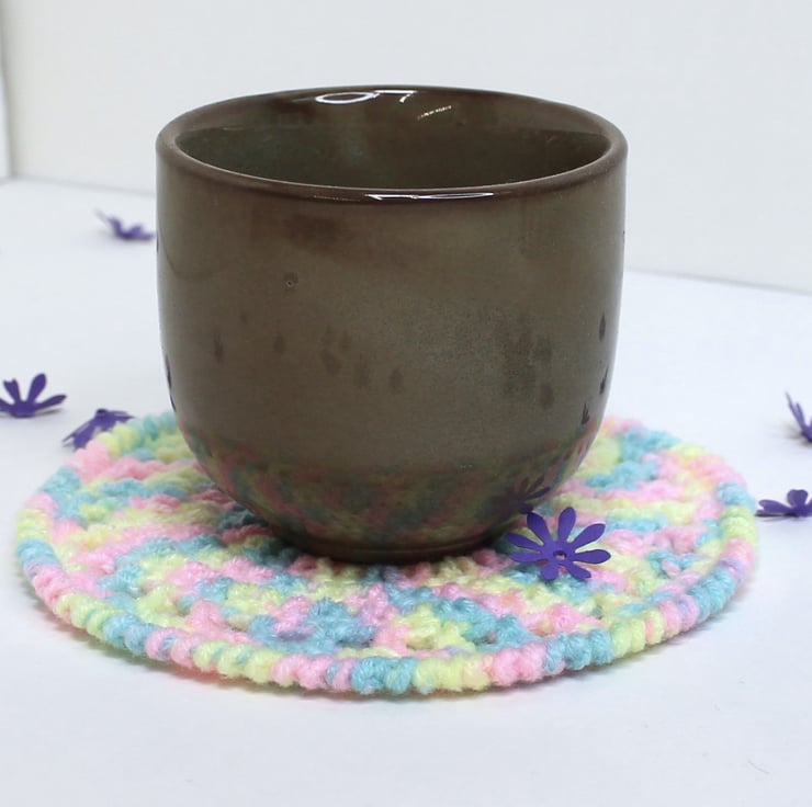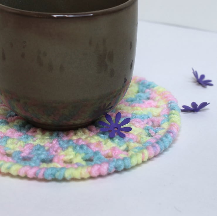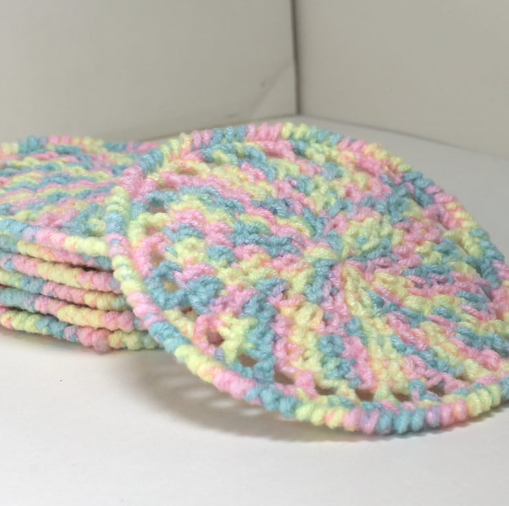 Beautiful pastel coasters that have been crocheted by hand using a tough but baby soft acrylic yarn. Even though they look like they're made of marshmallows, these coasters are sturdier than you might think. Great for kids, garden parties, small plant pots, or indulging the child in all of us that just loves colours. They are absorbent and machine washable.