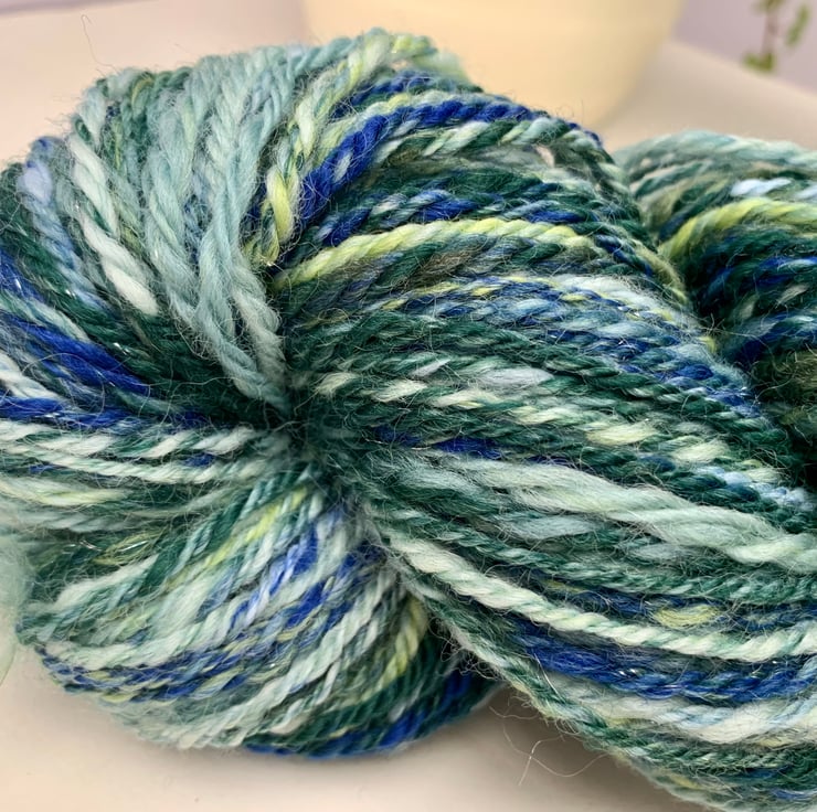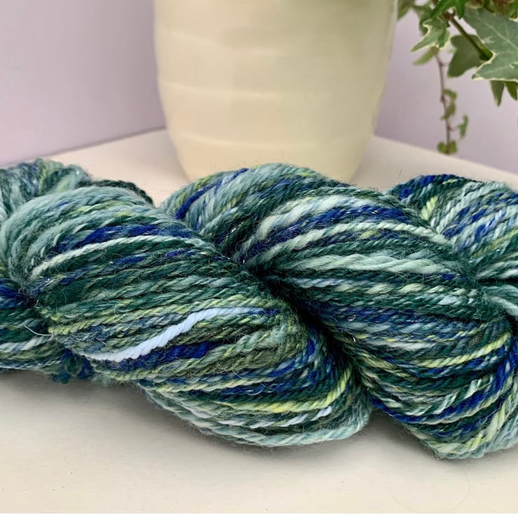 Hand blended and spun, OOAK Angelina, Corriedale, plant fibre, and wool.