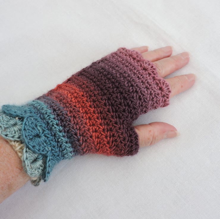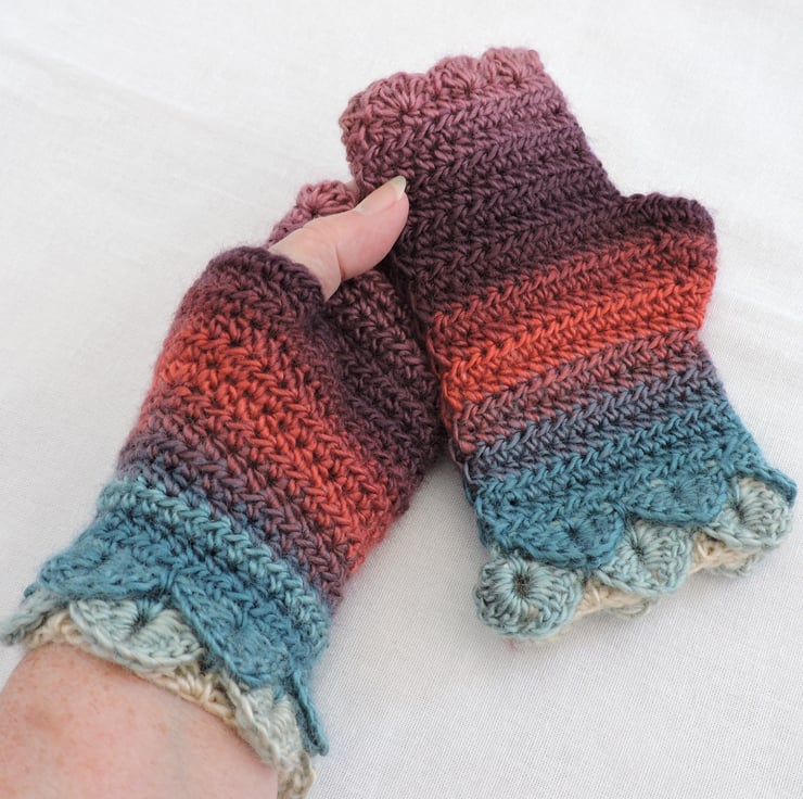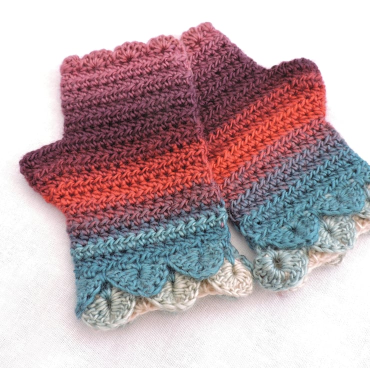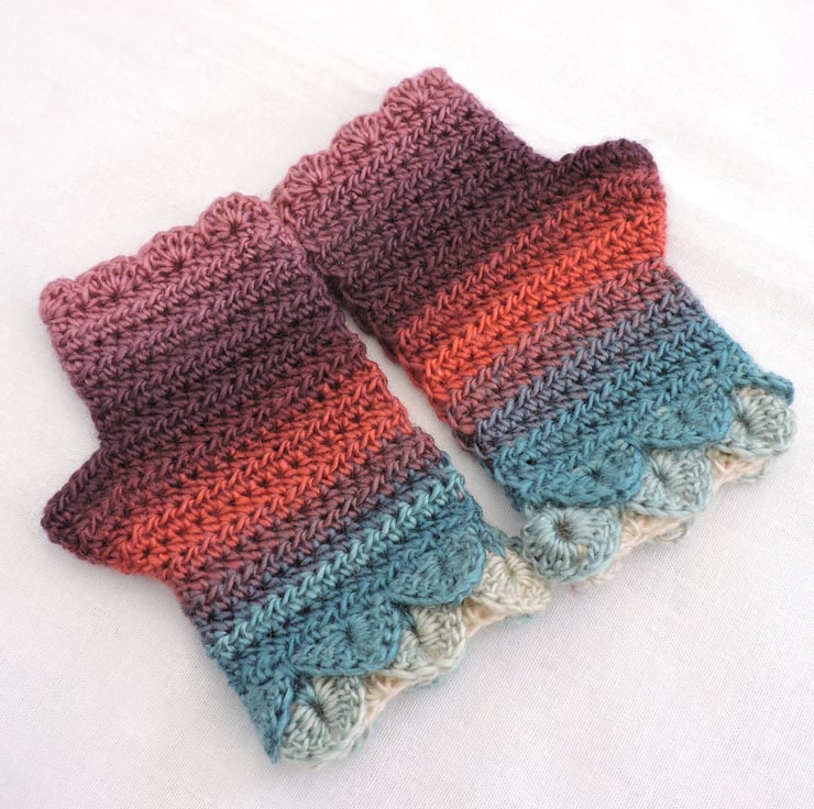 Adults fingerless mitts with dragon scale cuffs which I have crocheted with a double knit self striping acrylic yarn. Graduated colours of pink, lilac, aubergine, turquoise, coral and aqua. The mitts have two layers of dragon scales at the cuffs with a plain body and a wavy edge at the top. Colourful and warm mitts for the coming cold weather.
