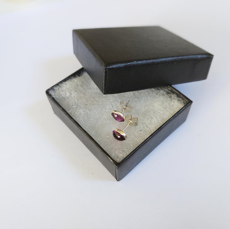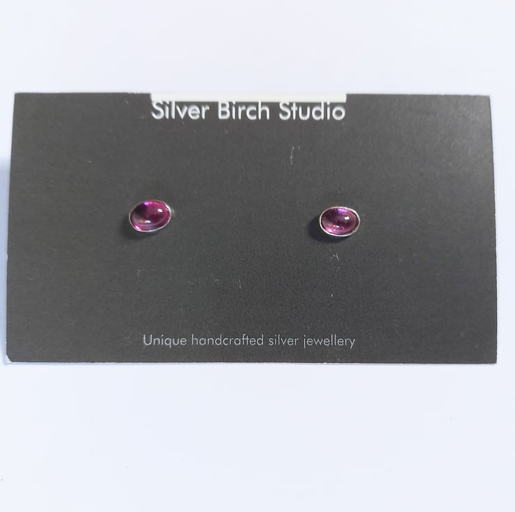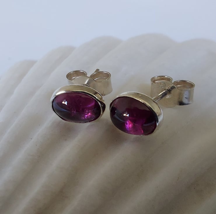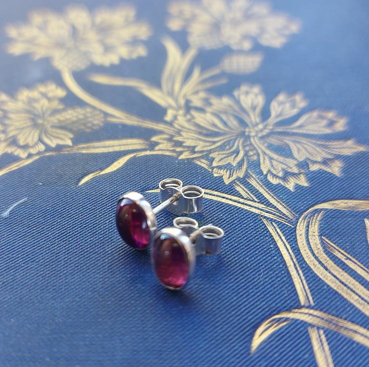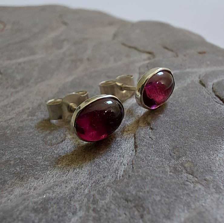 These dainty stud earrings are handmade and feature 7x5mm oval cabochons of Tourmaline in a gorgeous deep fuchsia pink. Tourmaline is a birthstone for October. It comes in a variety of colours and is a hard stone (7-7.5 on the Mho scale), making it very resistant to wear and tear. The stones are set in sterling silver bezel cups to which I have soldered silver ear posts. In wear, the posts connect with sterling silver scrolls to hold the earrings in position on the ear. The scrolls are stamped 925 to indicate sterling.