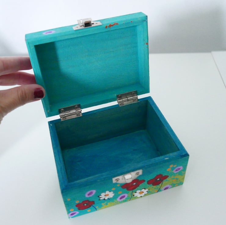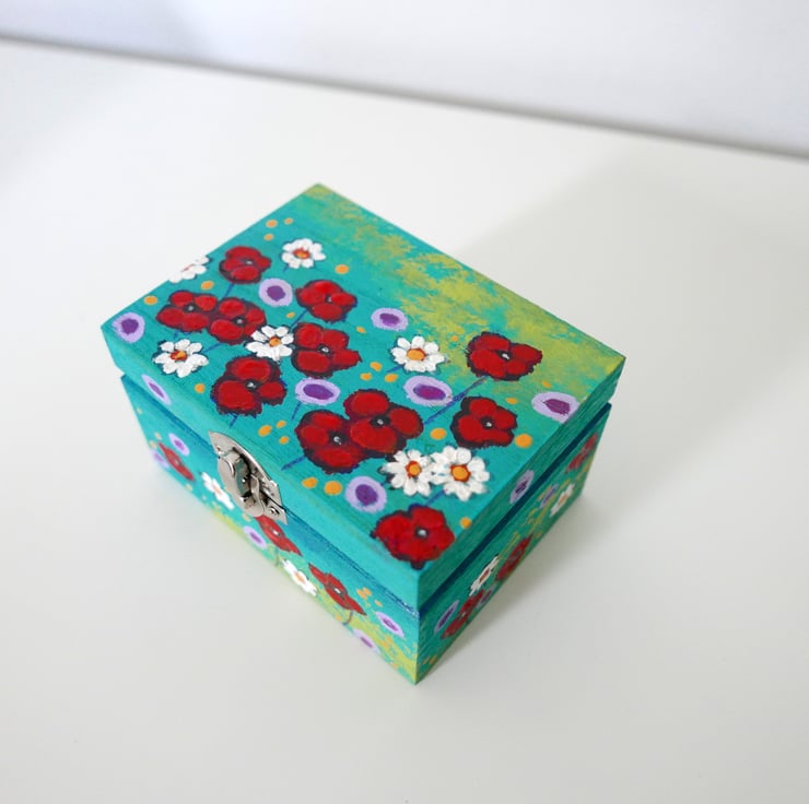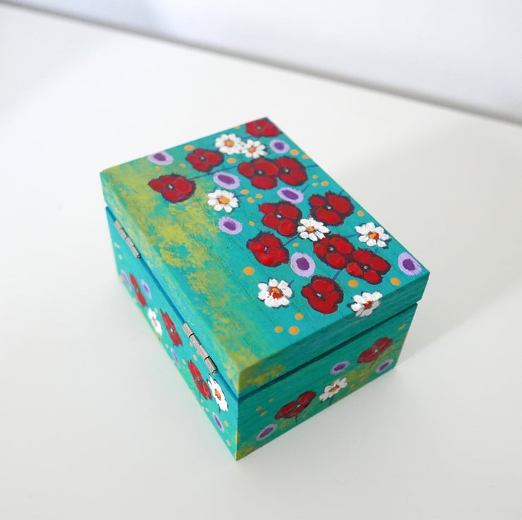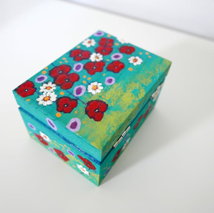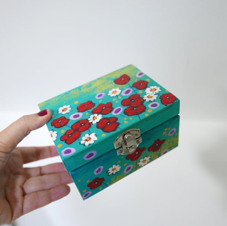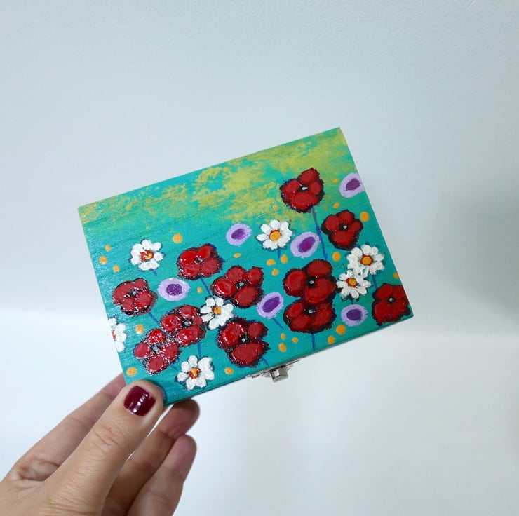 This trinket wooden box is hand painted by me in acrylic paint featuring red poppies, daisies, and wildflowers against a blue-green background. The box is painted in my usual style, and it looks like a mini painting with imperfections and brush strokes. It measures approx 4.75" x 3.75" x 2.75" high. It is painted inside and it's varnished for protection. Perfect gift idea for any girls or woman in your life.