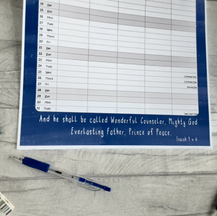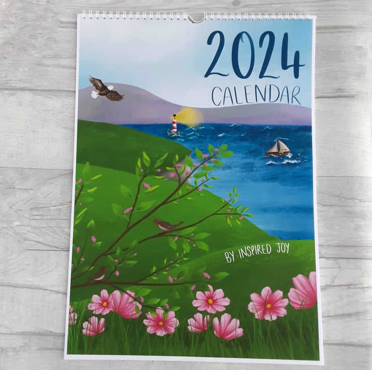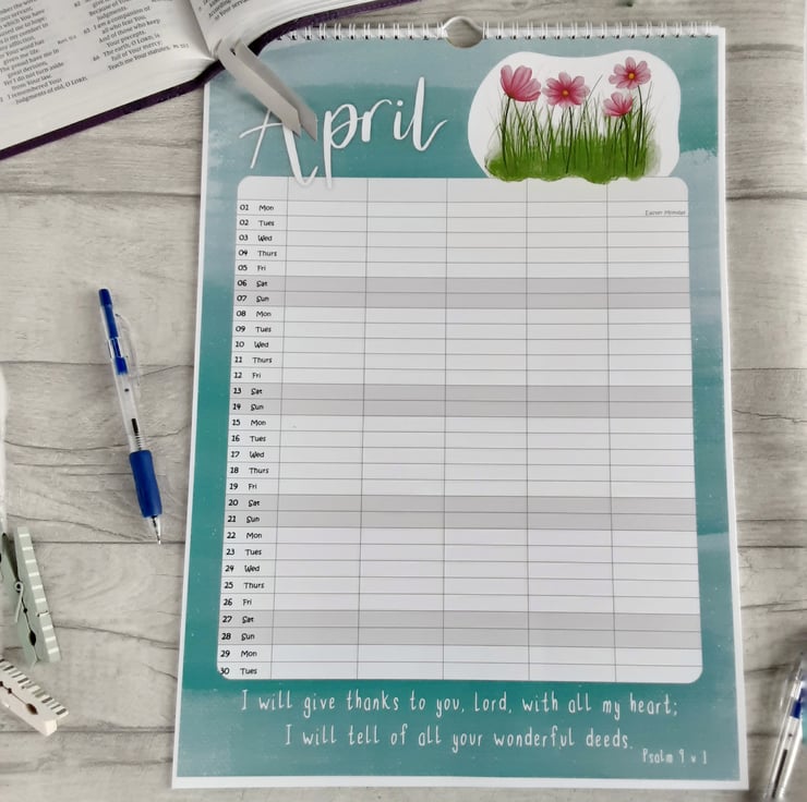 This special calendar has been designed, painted and printed by me, featuring my own artwork and a bible verse on every page.