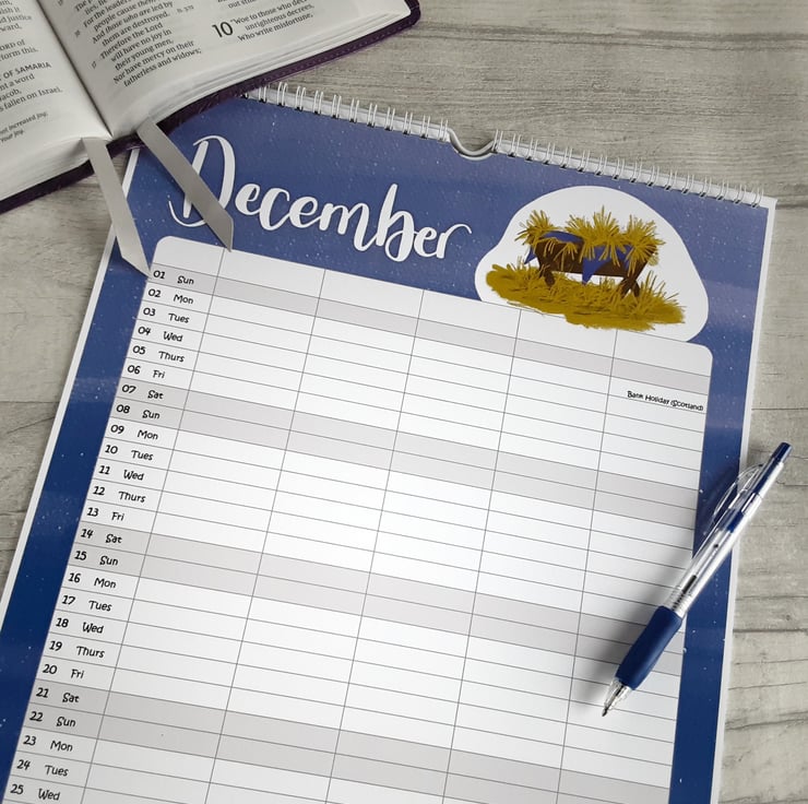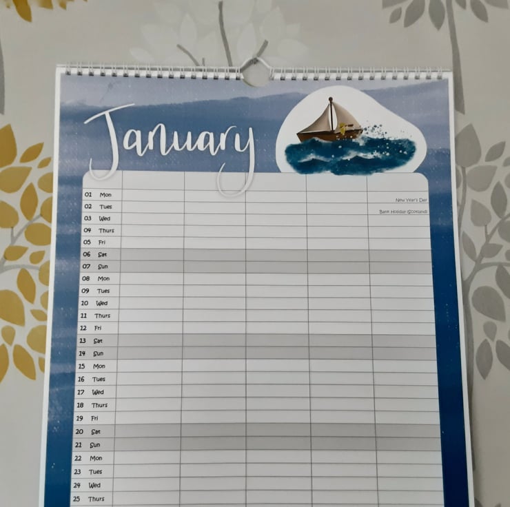 Each month has a large family planner style grid with 5 columns and the paper is a thick A3 piece with a smooth matt finish enabling you to write easily on the page. the calendars are wire bound with a traditional hanging hook. This calendar is A3 (approx 42cm x 30cm) when hanging on the wall.