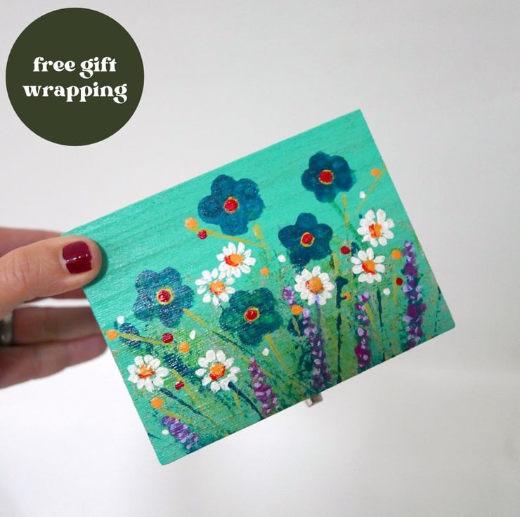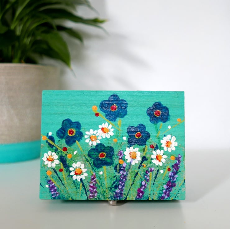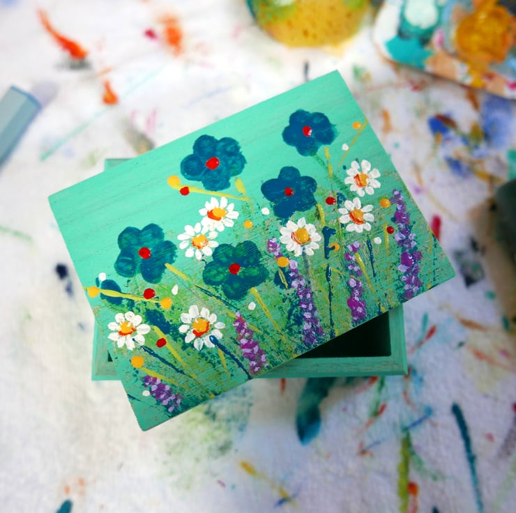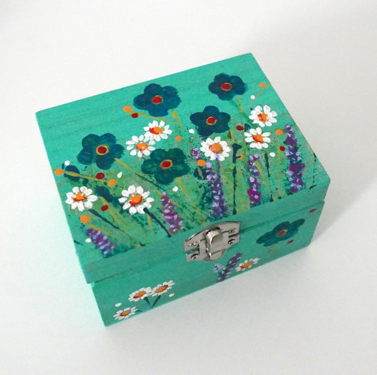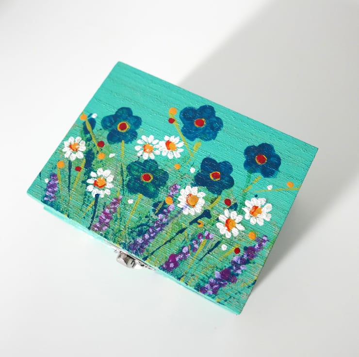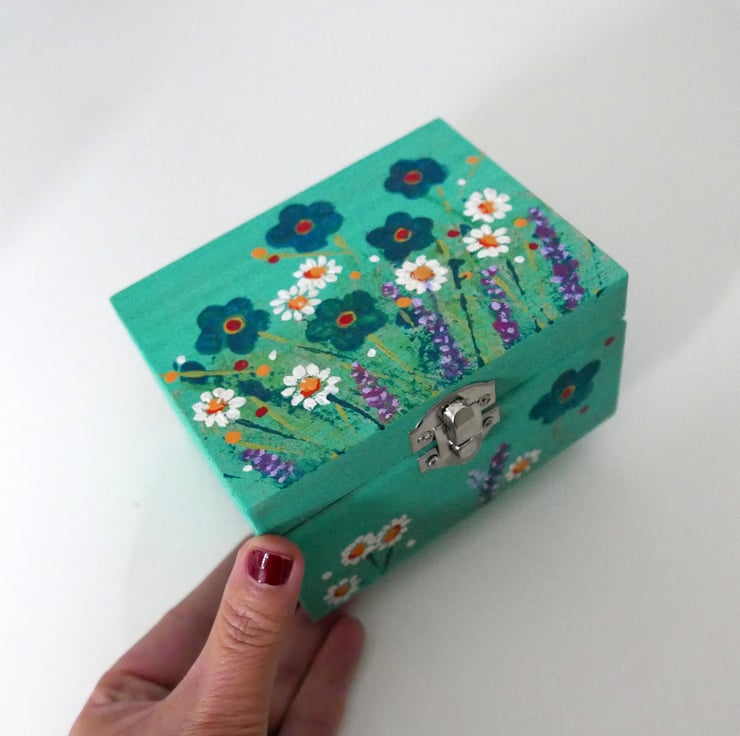 This meadow painting jewellery storage is hand painted by me with a meadow pattern against a mint green - turquoise background. The painting is done on a wooden box that you can use to store small items. I like creating objects that are both decorative and functional. You can easily find a space for this decorative box in your home and you can place jewellery or memorabilia inside. The box is painted inside as well and it is varnished for protection.