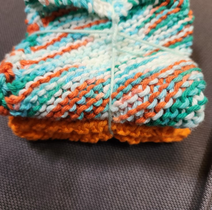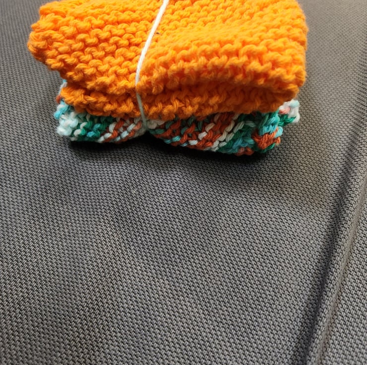A bundle of 2 hand knit cotton dishcloth or washcloths measuring approximately 8” x 9” each. Colours as shown.