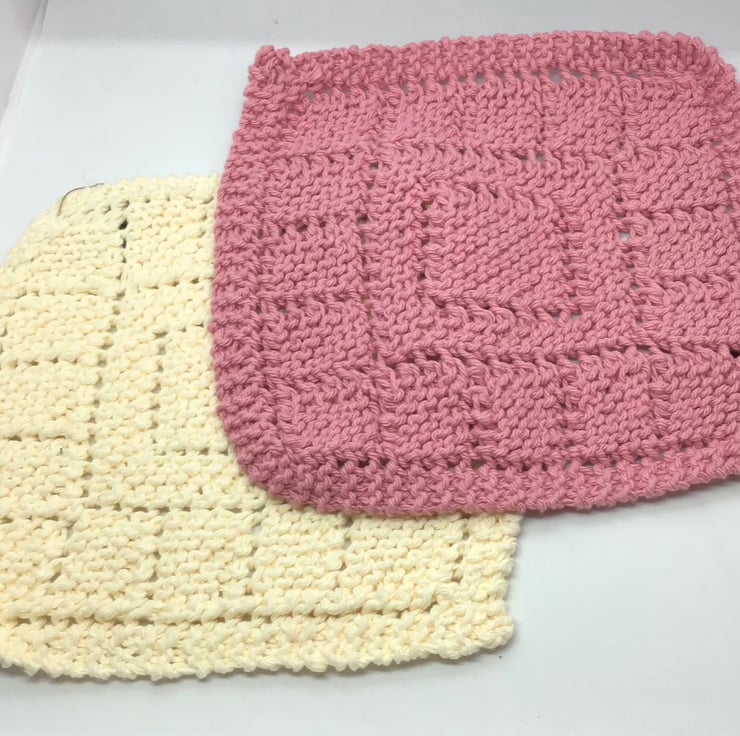 A bundle of 2 hand knit cotton dishcloth or washcloths measuring approximately 8” x 9” each. Colours as shown.