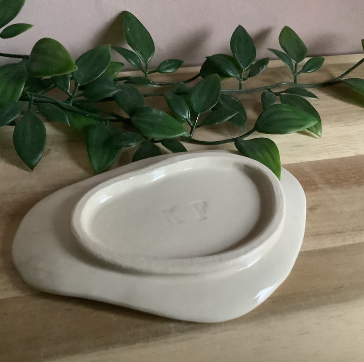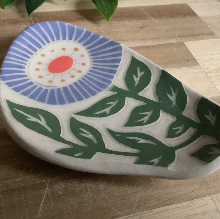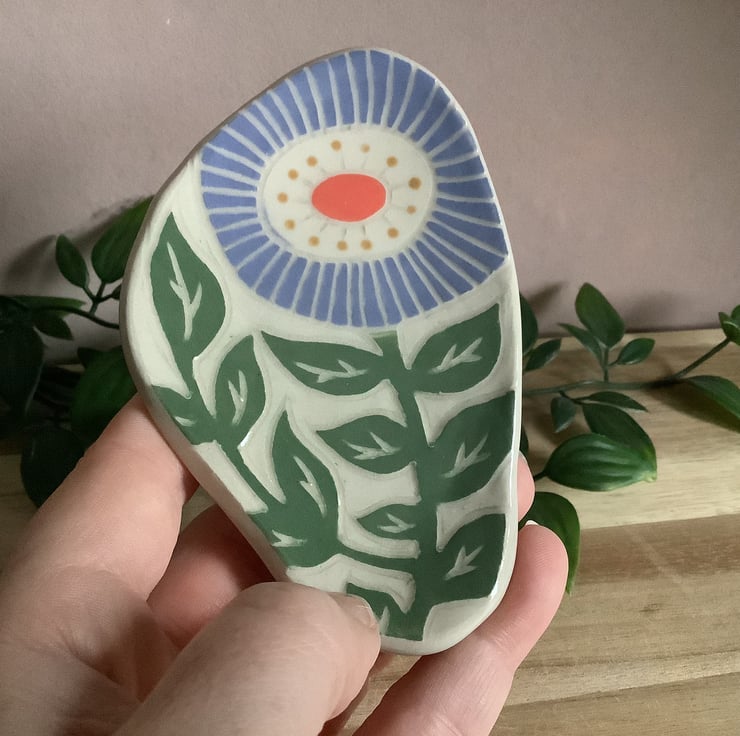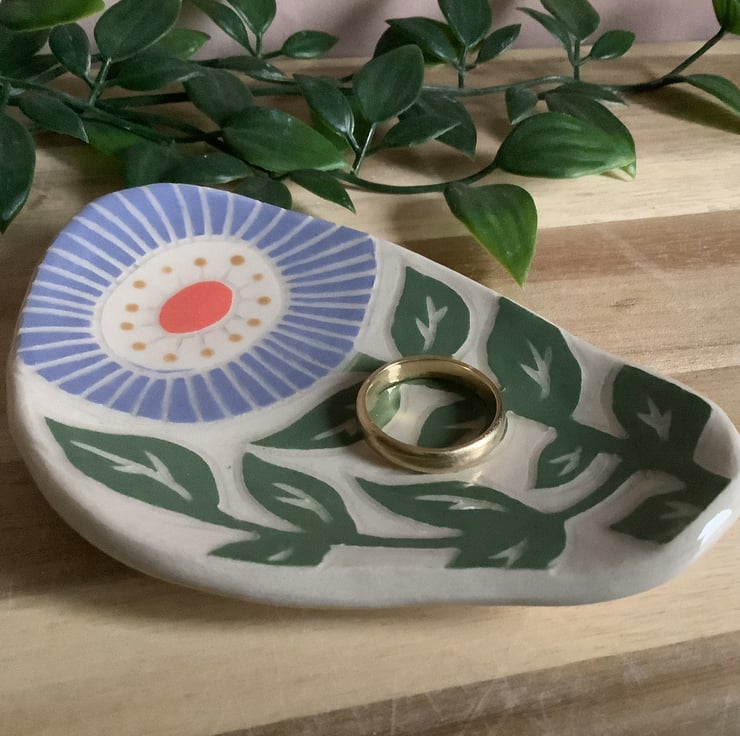 Handmade stoneware pottery ring dish with a retro inspired lilac flower and green leaves.