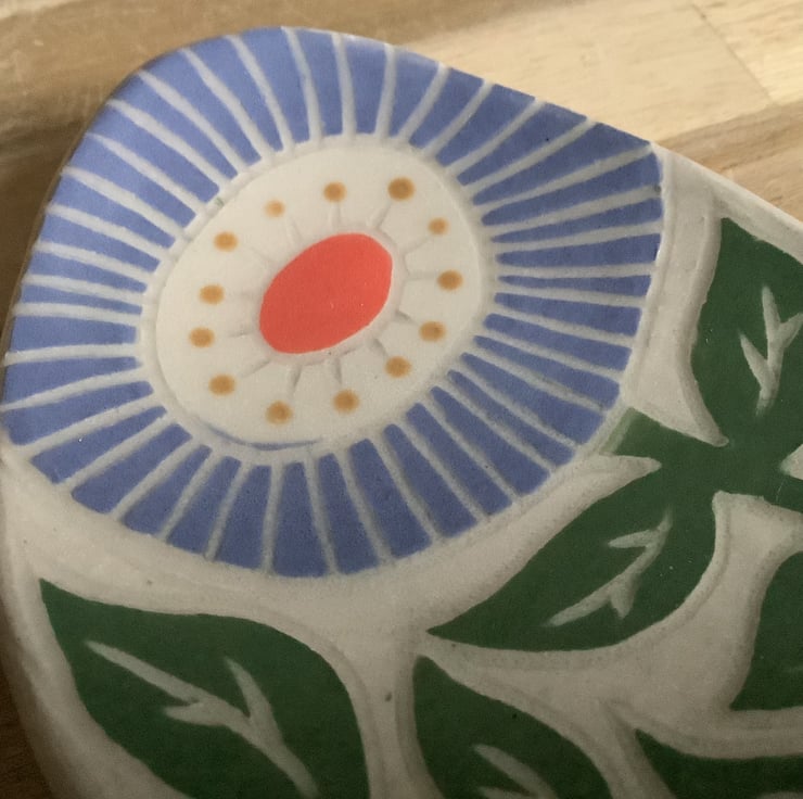 Decorated using the sgraffito technique, where the design is carved into layers of coloured slip. I then finish with small dots of contrasting colours.