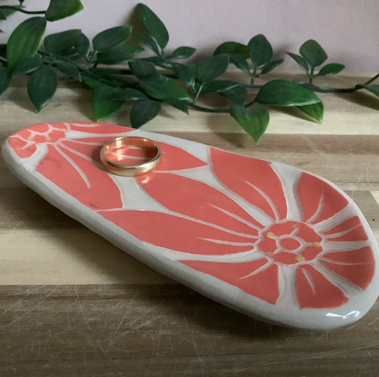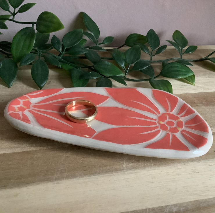 Handmade stoneware pottery dish with beautiful red flowers will brighten up your home. Use it as decoration or as a jewellery, ring or candle dish.