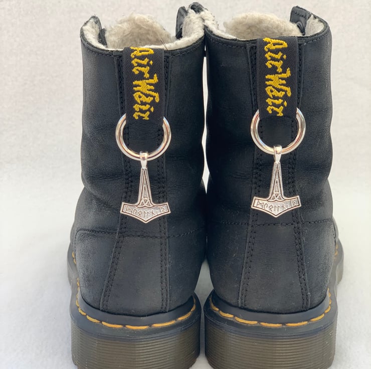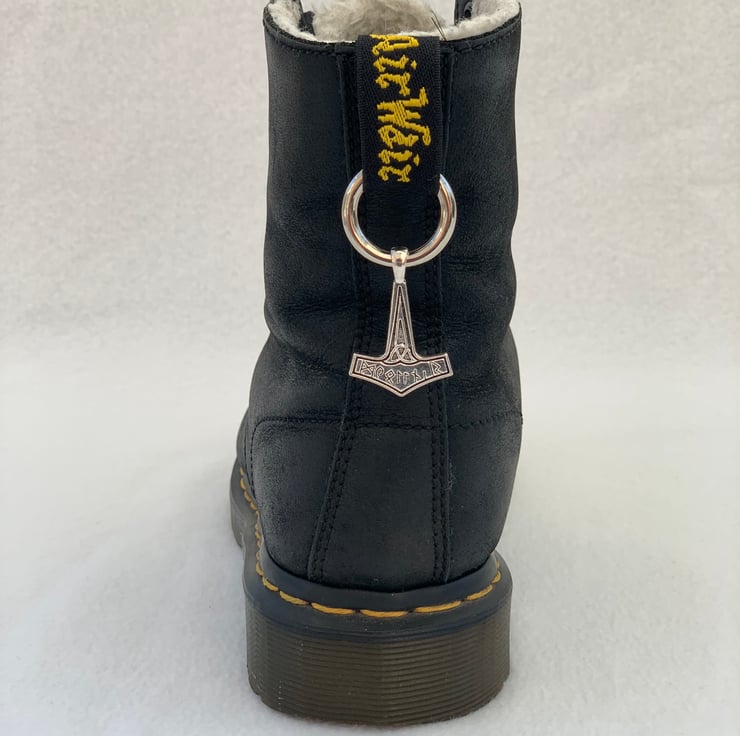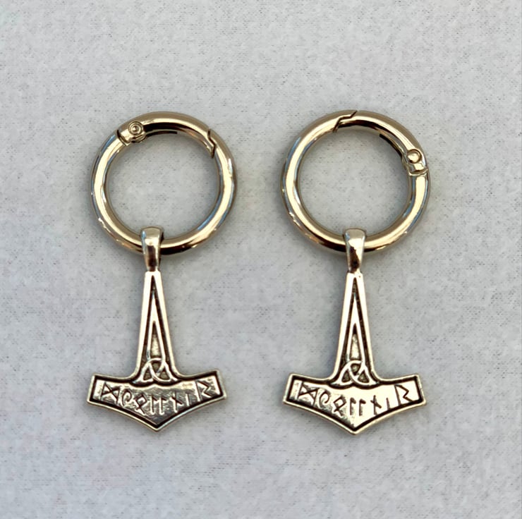 Alloy Thor’s hammer pendant measuring 37 x 25 x 2mm fitted with a stainless steel jump ring (for strength and longevity) onto a decorative alloy pendant bail and hung from a platinum coloured zinc alloy spring O Rings measuring approximately 27mm outer diameter, 4mm thick with a 20mm inner diameter.