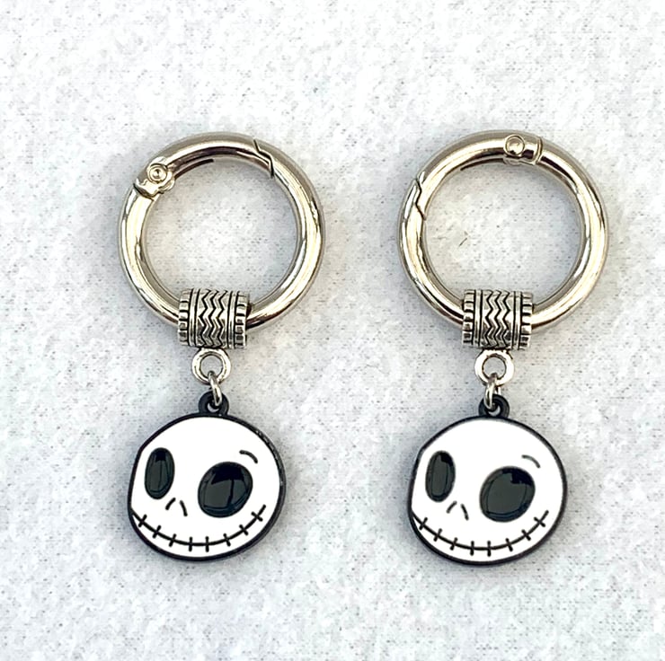 Alloy enamel Jack Skellington pendant measuring 22 x 20 x 2mm fitted with a stainless steel jump ring (for strength and longevity) onto a decorative alloy pendant bail and hung from a platinum coloured zinc alloy spring O Rings measuring approximately 27mm outer diameter, 4mm thick with a 20mm inner diameter.