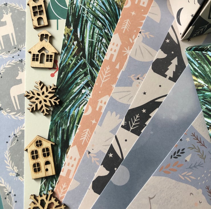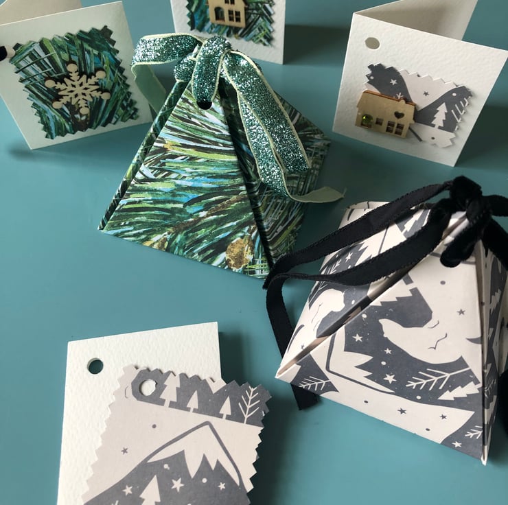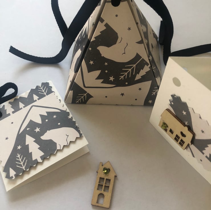 You have a template and clearly written easy to follow instructions, 2 pieces of quality double sided decorative Christmas card and ribbon for the tops. Also included are two small quality blank cards and wooden Christmas toppers to use as matching gift tags for your boxes.
