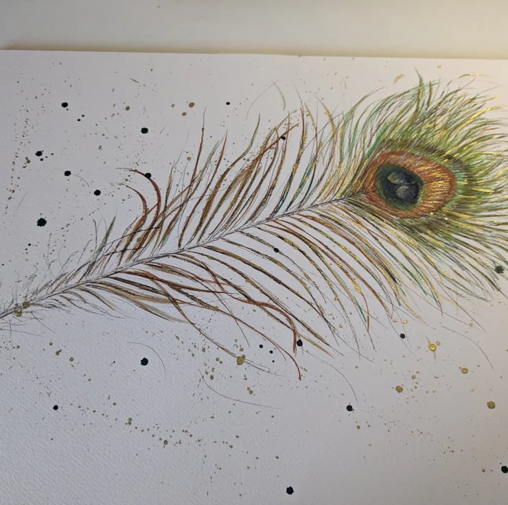 I have painted a couple of feathers before. When I was at an event earlier this year selling my art work, a lady from a neighbouring stall gave me a Peacock feather when I mentioned I was keen to do another feather painting.