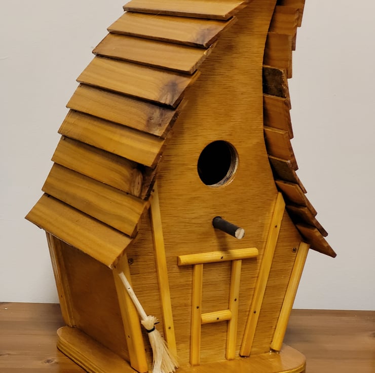 Beautiful birdbox to attract all sorts of small birds, curved waterproof roof, small broom so they can clean out the cobwebs. Just in case side hatch for you to cleanout the mess.